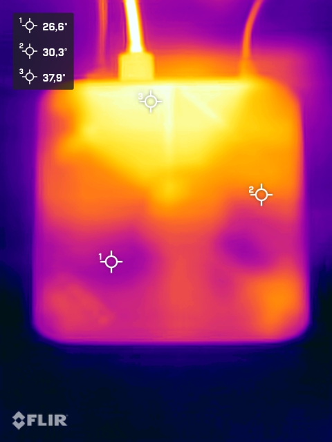 (+) Auf der Unterseite messen wir eine maximalen Wert von 38.2 °C (im Vergleich zum Durchschnitt von 36.3 °C).