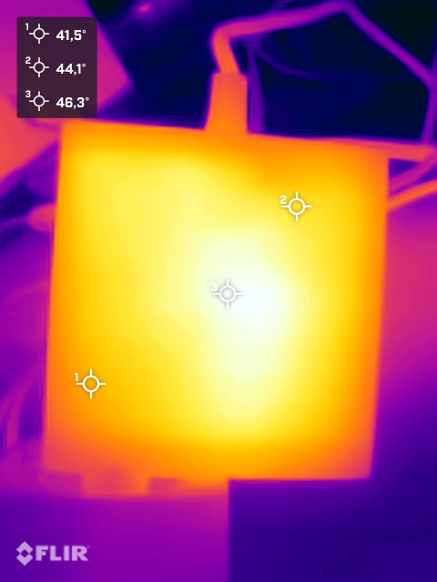 (+) Ohne Last messen wir eine durchschnittliche Temperatur von 27.5 °C auf der Oberseite. Der Klassendurchschnitt erreicht 32.4 °C.