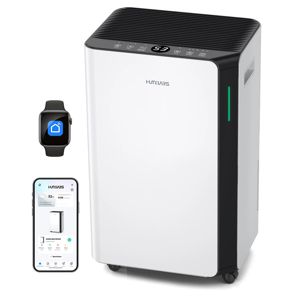 Der Humilabs I D068C wartet mit den drei intelligenten Modi „Trocknen“, „Automatisch“ oder „Schlafen“ auf. Dank nur 41 dB arbeitet das Gerät sehr leise und kann somit auch in Schlafräumen aufgestellt werden. Über das integrierte WLAN kann der Luftentfeuchter nicht nur über die SmartLife-App auf Smartphones und Smartwatches, sondern auch die Sprachassistenten Alexa und Google Home gesteuert werden. Und mit seinen 360°-Rädern und dem integrierten Griff lässt er sich zudem einfach von einem Raum zum anderen bewegen.