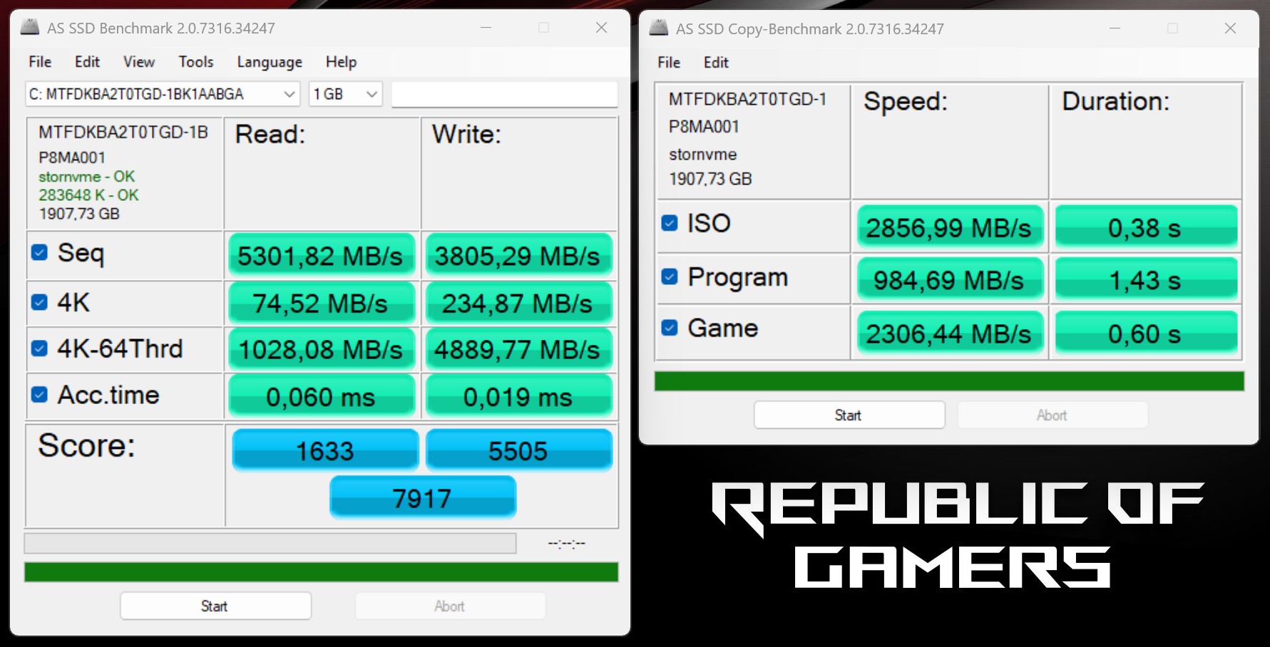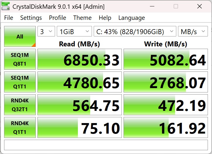 Im Asus ROG NUC 15 arbeitet eine 2-TB-M.2-SSD von Micron, die mit voller PCIe-4.0x4-Geschwindigkeit arbeitet. Die Leistung reicht, um sich einen guten Platz im Mittelfeld zu sichern. Zudem bleibt die Leistung auch unter Last konstant und ohne Einbrüche. Insgesamt lassen sich zwei M.2-2280-SSDs im Gerät verbauen.