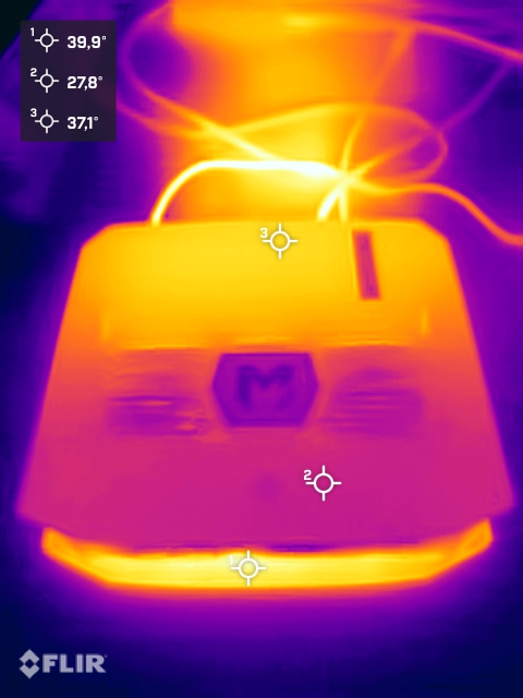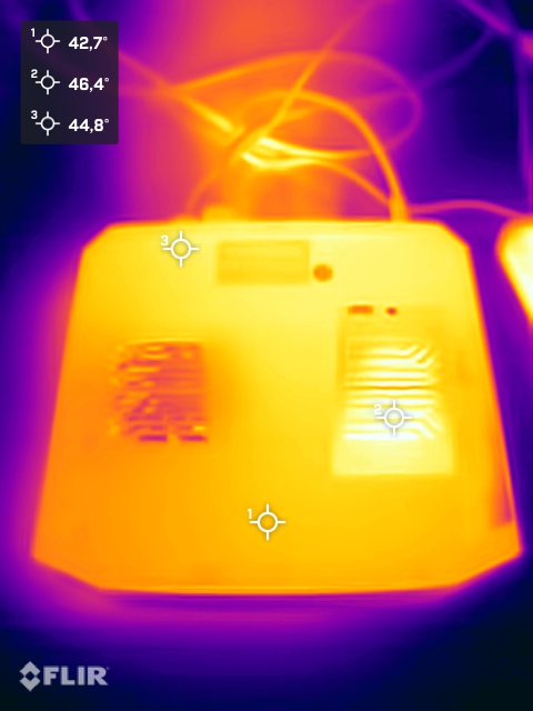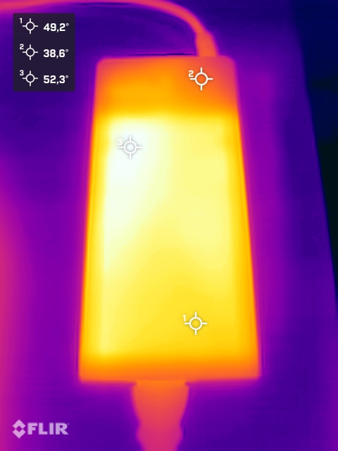 (-) Auf der Unterseite messen wir eine maximalen Wert von 48.1 °C (im Vergleich zum Durchschnitt von 36.3 °C).