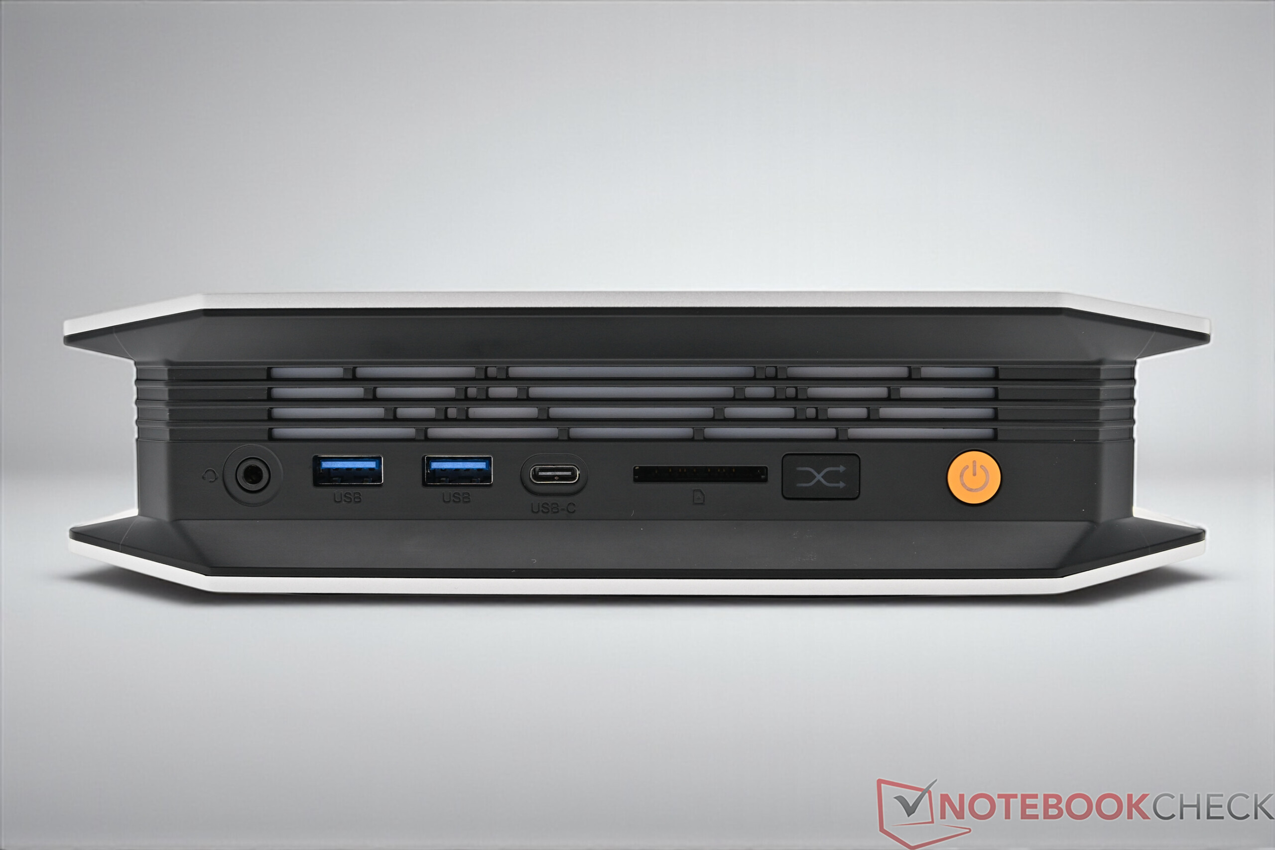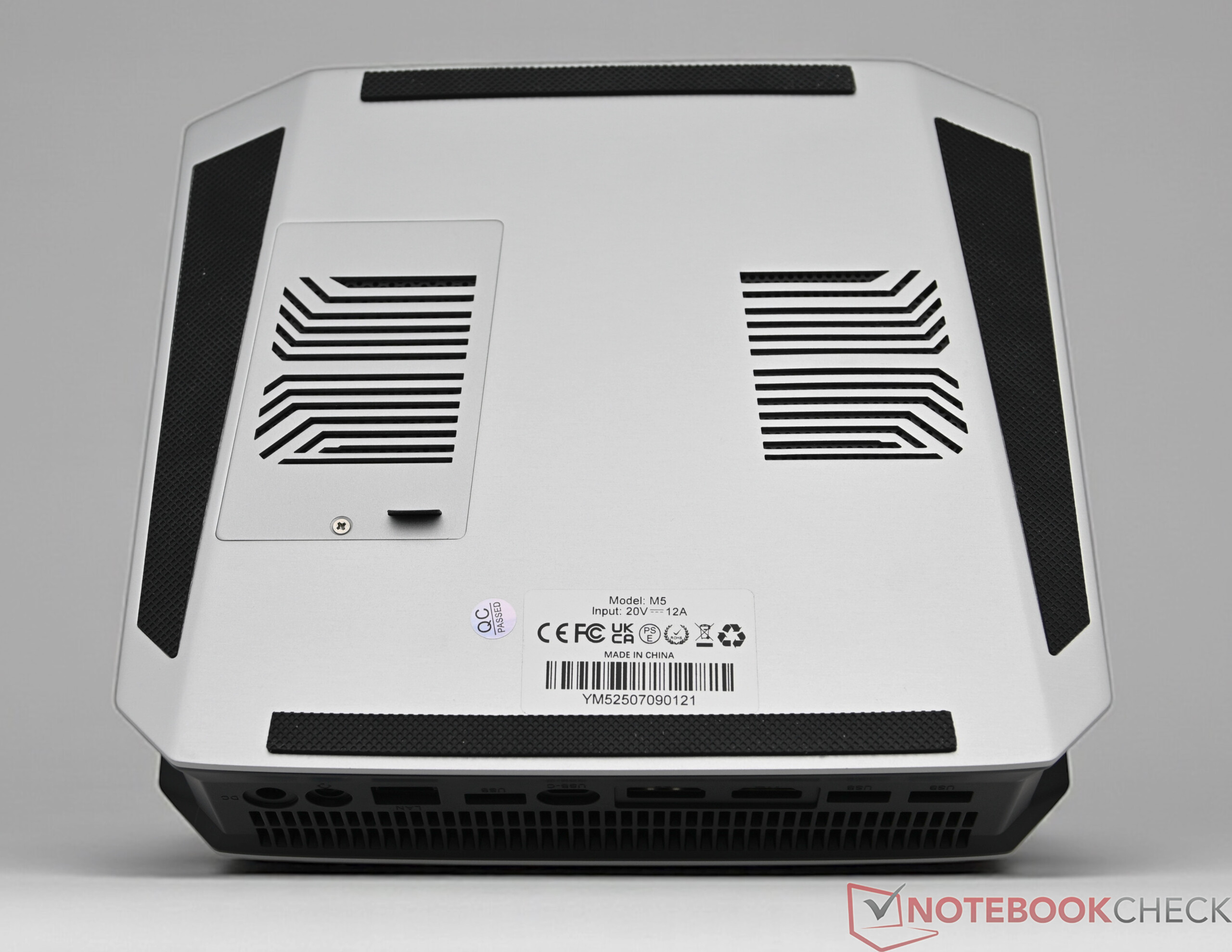 Der Bosgame M5 setzt auf ein robust verarbeitetes Gehäuse mit Kunststoffkern, dessen Ober- und Unterseiten aus Metall gefertigt sind und dem Mini-PC eine wertige Haptik verleihen. Auf der Oberseite befinden sich einige Lufteinlässe, die jedoch vergleichsweise klein ausfallen. Die dezente Farbgestaltung wirkt elegant und fügt sich harmonisch in ein schlichtes Arbeitsumfeld ein.
