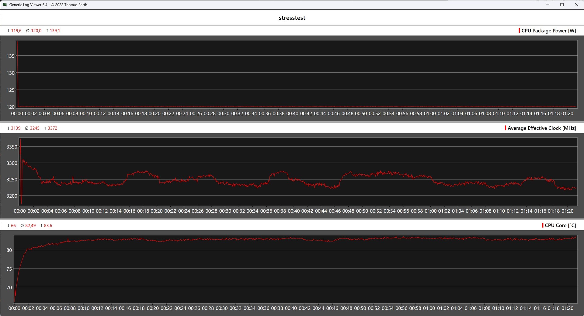 Das Gehäuse des Bosgame M5 erwärmt sich unter Last auf der Unterseite spürbar. Extreme Hotspots mit Werten über 50 °C gibt es allerdings nicht. Wie vom Hersteller vorgesehen arbeitet der Prozessor unter Last kurzzeitig mit bis zu 140 Watt, wenngleich bei Dauerlast 120 Watt stabil erreicht werden.