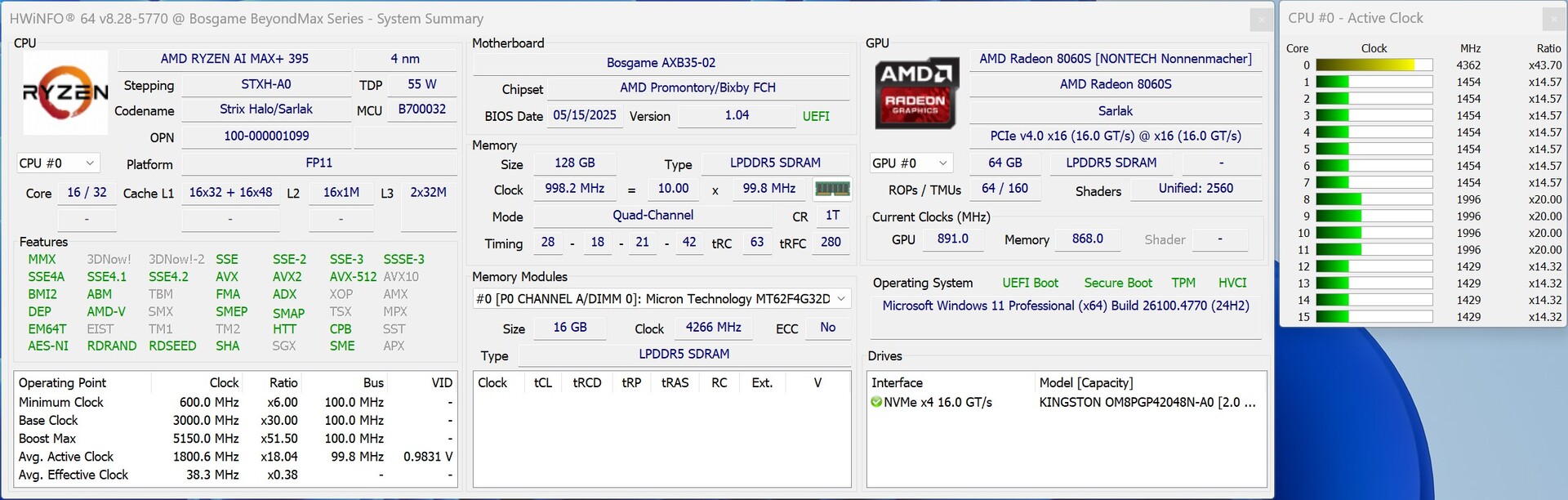 Der AMD Ryzen AI Max+ 395 zählt zu AMDs aktuellen Flaggschiffen unter den mobilen Prozessoren. Dank seiner hohen Rechenleistung und der performancestarken iGPU eignet sich das SoC ideal für ultrakompakte PCs mit maximaler Performance. Im Bosgame M5 kommen zudem 128 GB Arbeitsspeicher zur Verfügung, was der aktuell besten Ausstattung entspricht.