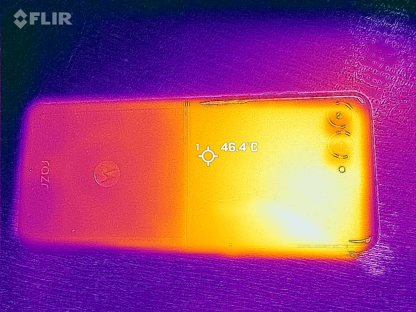 (-) Auf der Unterseite messen wir eine maximalen Wert von 53.5 °C (im Vergleich zum Durchschnitt von 34 °C).