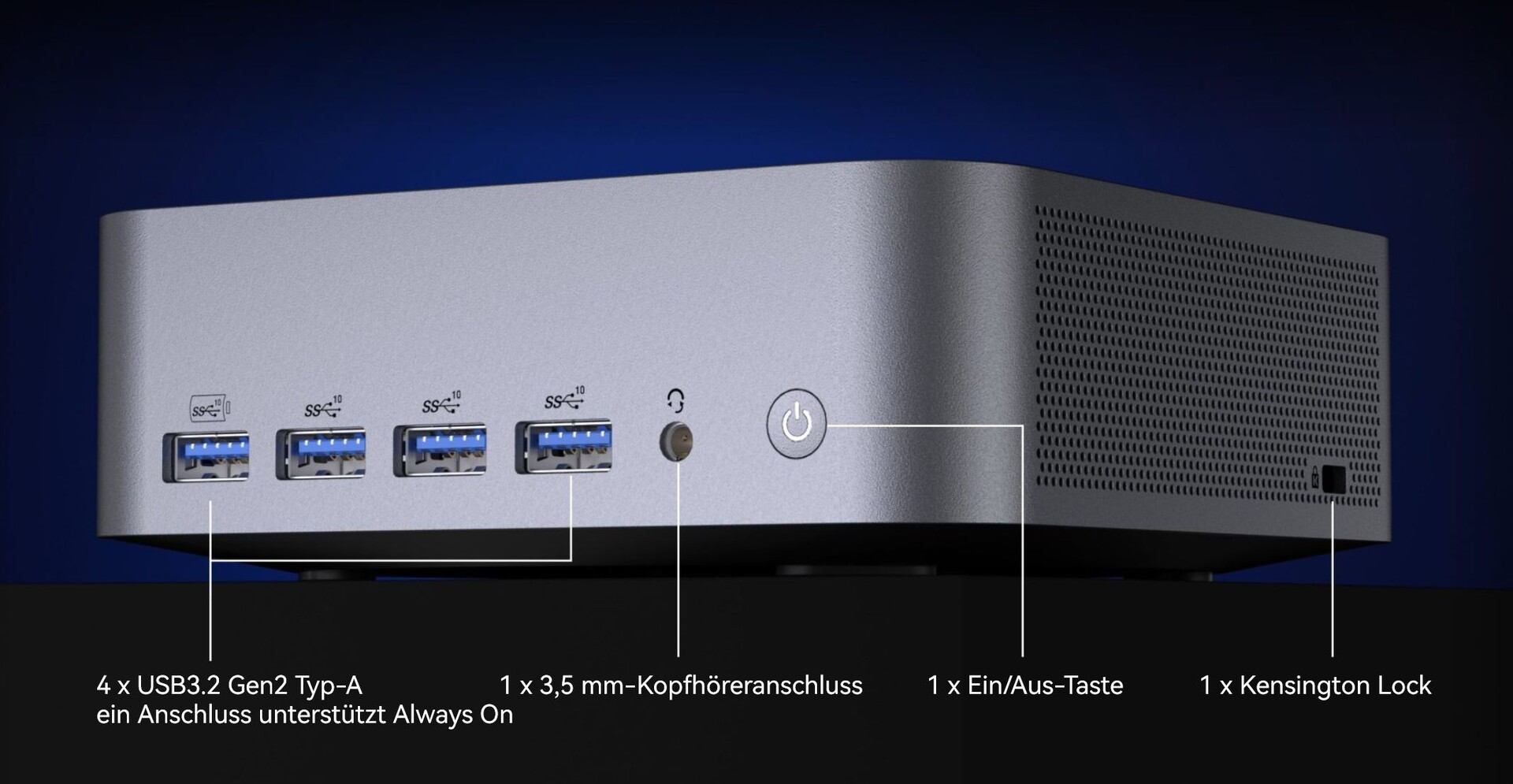 Nicht minder imposant ist die Performance der Intel Arc Grafikkarte. Sie ermöglicht nicht nur rasantes Gaming, sondern kann auch bis zu vier Bildschirme mit 4K oder ein Display mit 8K-Auflösung versorgen. Somit ist ein Multi-Screen-Setup mit diesem winzigen Computer genauso kein Problem wie der Anschluss eines extrem hochauflösenden 8K-Monitors. Hierfür stehen zweimal HDMI 2.0 auch zweimal USB4 zur Verfügung.