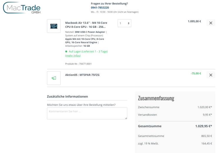 Das neue MacBook Air M4 von Apple gibts kurz nach Release bereits mit sattem Rabatt von 170 Euro bei MacTrade. Der Hersteller ruft 1.199 Euro für das Einstiegsmodell mit 16 GB RAM und 256 GB SSD auf, während man jetzt schon für nur 1.029 Euro dabei ist.