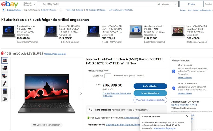 Ein solides 15,6-Zoll-Business-Notebook mit zwei RAM-Bänken und genügend Sicherheitsfeatures zum günstigen Preis, das entspricht aktuell dem Lenovo ThinkPad L15 G4 AMD, das es schon für 789 Euro versandkostenfrei im eBay-Shop von LapStore gibt. Um auf den Deal-Preis zu kommen, gibt man den Gutscheincode "LEVELUP24" im Warenkorb ein. dieser gilt noch bis zum 21.02.2024. Der nächstbeste Preis für diese Konfiguration liegt bei um die 1.000 Euro.