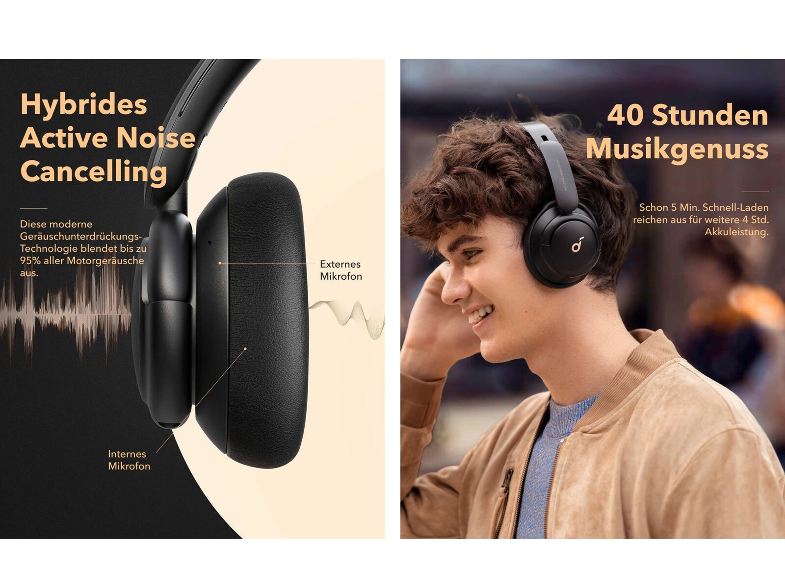Die Geräuschaktivierung lässt sich durch einen 1- bis 2-sekündigen Druck auf die Ohrmuschel aktivieren und deaktivieren. An der rechten Ohrmuschel befinden sich Bedienelemente zur Steuerung der Musikwiedergabe. Die Akkulaufzeit gibt Anker mit bis zu 60 Stunden an (40 Stunden bei eingeschalteter ANC-Funktion). Wenn es mal schnell gehen muss, lassen sich die Over Ears dank Schnellladefunktion innerhalb von 5 Minuten für eine Musikwiedergabe von bis zu 4 Stunden aufladen. Geladen wird per USB-Typ-C-Kabel.
