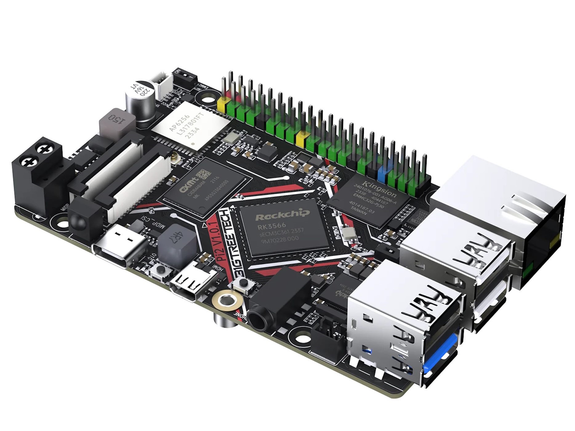 Zum Einsatz kommt ein Rockchip RK3566 mit vier Cortex A55-Rechenkernen und einer Taktfrequenz von 1,8 GHz und einer Grafikkarte vom Typ Mali-G52. Die integrierte NPU soll KI-Anwendungen mit bis zu 0,8 TOPS beschleunigen können. Der Arbeitsspeicher misst standardmäßig zwei Gigabyte, der LPDDR4-Arbeitsspeicher kann aber auch konfiguriert werden - und zwar auf eine Speicherkapazität von einem, vier und acht Gigabyte. Es kommt im Gegensatz etwa zum Raspberry Pi auch ein eMMC-Speicher zum Einsatz. Die Standardgröße beträgt 32 Gigabyte, dabei ist auch dieser grundsätzlich konfigurierbar, eine Speicherkarte nutzbar.