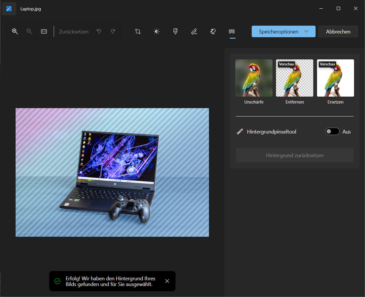 Entspricht die Maskierung den Vorstellungen, stehen drei Optionen zur Verfügung: Den Hintergrund unscharf zeichnen, löschen oder durch eine einfarbige Fläche ersetzen. Auch hier gilt: Die Ergebnisse müssen manuell gespeichert werden, da keine automatische Speicherung stattfindet.