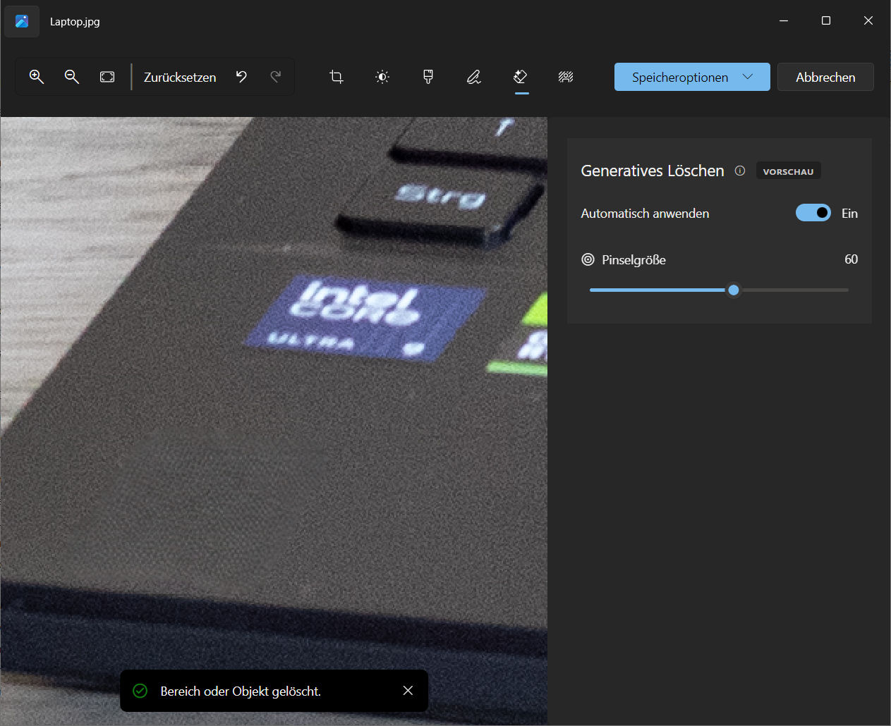 Ein Klick auf die Schaltfläche "Löschen" öffnet einen Bereich mit der Bezeichnung "Generatives Löschen". Hier wird mittels des Mauszeigers (linke Maustaste gedrückt halten) das Areal innerhalb des Bildes markiert, das anschließend automatisch per künstlicher Intelligenz entfernt werden soll. Das Ergebnis muss manuell gespeichert werden. Eine automatische Speicherung findet nicht statt.