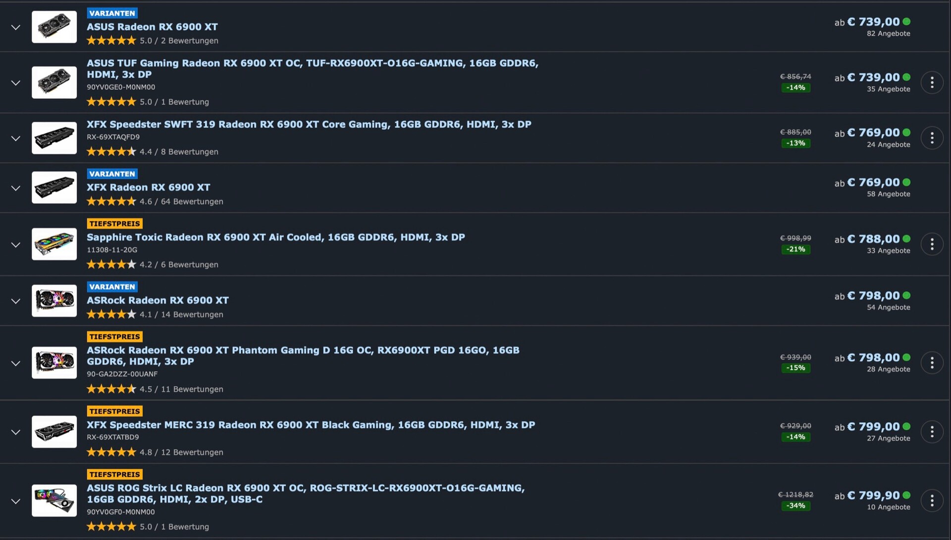 Die AMD Radeon RX 6900 XT war noch Anfang September kaum unter 1.099 Euro zu bekommen, mittlerweile sind im Preisvergleich zahlreiche Varianten der Grafikkarte für unter 800 Euro zu finden. Die Asus TUF Gaming Radeon RX 6900 XT OC mit drei Lüftern wird als günstigste Variante der GPU für 739 Euro angeboten, es ist aber auch möglich, ungewöhnlichere OEM-Varianten für unter 800 Euro zu finden.