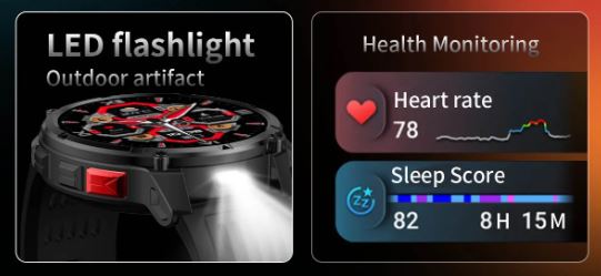 Verbaut ist ein 1.100 mAh starker Akku, wobei die Uhr mit 14,5 Millimetern auch relativ dick ist und somit ein wenig stärker auftragen dürfte. Verbaut ist ein 1,7 Zoll großer Bildschirm auf Basis der IPS-Technologie, welcher mit 360 x 360 Pixeln auflöst. Das Uhrgehäuse selbst besteht zumindest teilweise aus einer Zinklegierung, geworben mit einer zumindest an MIL-STD-Anforderungen angelehnte Robustheit. Die Wasserdichtigkeit ist laut Rollme bis zu einem Prüfdruck von 5 ATM gegeben. Verbaut ist eine Taschenlampe, was etwa beim Zelten nützlich sein könnte. Ein GNSS-Modul fehlt wie für solche günstigen Smartwatches durchaus typisch, allerdings steht ein Kompass bereit, in Kombination mit einer Karte dürften sich somit Möglichkeiten zur Navigation ergeben.