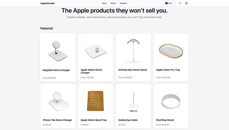 Die meisten der angebotenen Produkte stammen aus einem Apple Store, und sind daher gebraucht. Je nach Zustand fallen die Preise auch sehr hoch aus – der Apple iPhone MagSafe Demo Charger kostet in neuwertigem Zustand beispielsweise 199 Euro. Der Shop liefert auch nach Deutschland und Österreich.