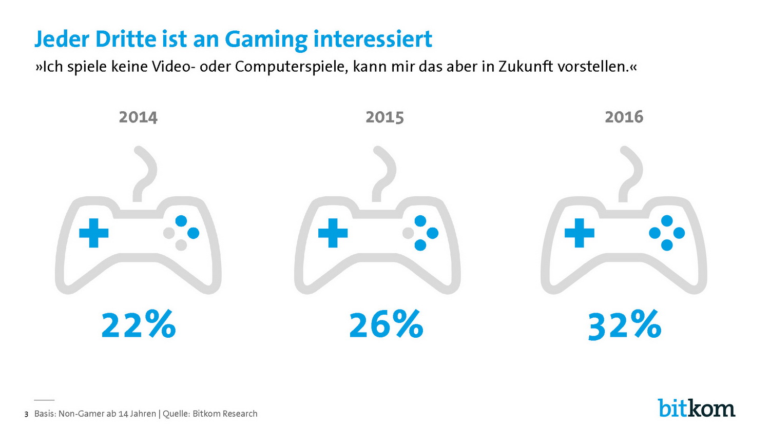 Aber auch das Interesse der Nichtspieler am Gaming nimmt deutlich zu. Vor 2 Jahren konnten sich noch 22 Prozent vorstellen, in Zukunft Computer- oder Videospiele zu spielen. Heute tun das schon 32 Prozent. Bei den 14- bis 29-Jährigen, die bislang keine Computer- oder Videospiele spielen, sagen sogar 61 Prozent, dass sie sich vorstellen können, künftig zu daddeln. Bei den über 65-Jährigen sind dies 21 Prozent.
