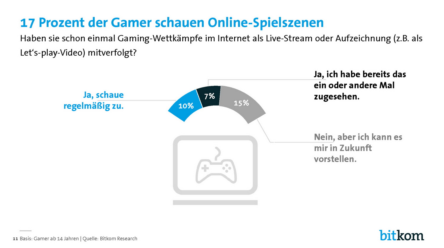 Neben der eigenen Spielerfahrung ist vielen Gamern auch das gemeinsame Spielerlebnis wichtig. 17 Prozent der Gamer spielen nicht nur selbst, sondern sehen sich auch regelmäßig die Spiele anderer Gamer per Livestream oder als aufgezeichnetes Let's Plays an. Portale wie Twitch, Ustream oder Hitbox bieten Gamern die Möglichkeit, sich zum Beispiel per Chat miteinander austauschen während sie den Wettkämpfen anderer Spieler zusehen.