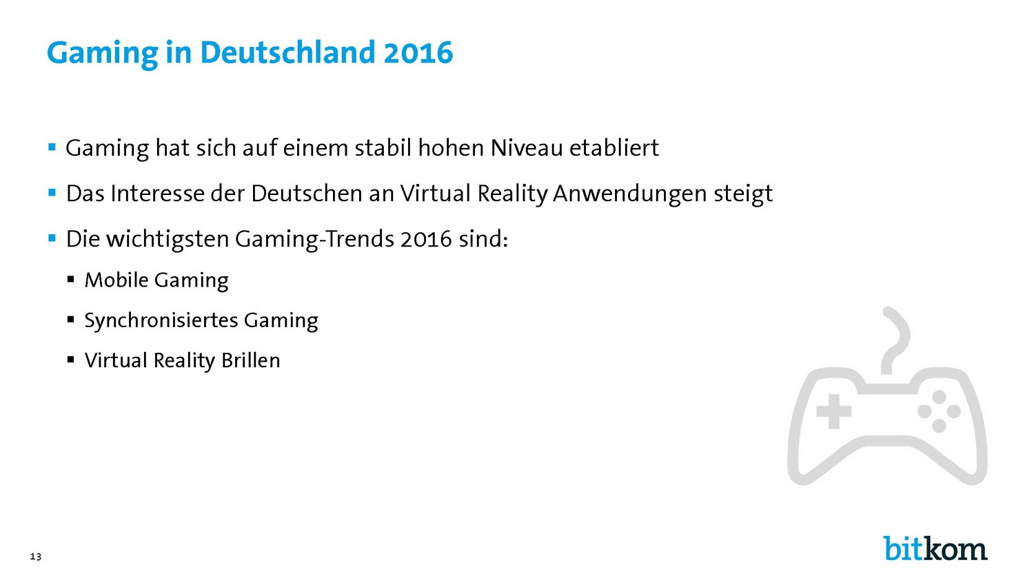 Der Bitkom unterstreicht, dass der Einsatz von Technik unter dem Schlagwort Virtual Reality (VR) zu einem ganz wichtigen Bereich der Gaming-Branche geworden ist: 39 Prozent der Gamer in Deutschland haben konkretes Interesse am Kauf einer Virtual-Reality-Brille. Das entspricht rund 20 Millionen potenziellen Käufern. Die meisten Befragten können sich den Einsatz von VR-Brillen in Verbindung mit Simulationsspielen wie Flugsimulationen (40 Prozent), oder Fanstasy- und Rollenspielen (37 Prozent) vorstellen. Rund ein Viertel würde VR-Brillen für das Spielen von Social Games (27 Prozent) oder Actionspiele (23 Prozent) nutzen, jeder Fünfte für Renn- und Sportspiele sowie Jump'n Runs (jeweils 19 Prozent).