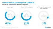 Bei der Frage, warum sie nicht spielen, geben 60 Prozent der Befragten an, dass ihnen schlicht die Zeit dazu fehlt. 57 Prozent macht Spielen generell keinen Spaß. Nur noch 7 Prozent meinen, dass Video- und Computerspiele nur etwas für Kinder sind. Im Vorjahr waren es noch 12 Prozent.