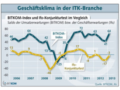 Damit verbessert sich der Bitkom-Index deutlich von 41 auf 64 Punkte. Die Bitkom-Branche war und ist ein Wachstumsmotor für Deutschland, so der Bitkom. Sie wird in diesem Jahr damit deutlich stärker wachsen als die Wirtschaft insgesamt. Besonders zuversichtlich sind Softwarehäuser. 87 Prozent gehen von Umsatzsteigerungen aus. Auch Anbieter von IT-Dienstleistungen (82 Prozent) rechnen mit guten Geschäften. Der ungebrochene Boom bei Smartphones und Tablets mit steigendem Bedarf an mobilen Lösungen sowie die weiter hohe Nachfrage nach Cloud-Computing führen hier zu wachsenden Umsätzen.