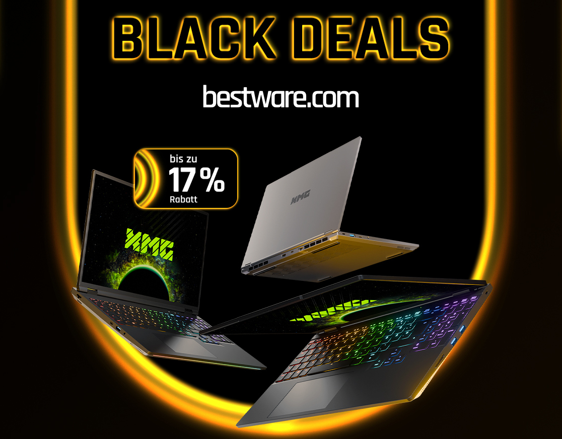 Einen Monat lang gibt es dank der Black Deals 2025 die besten Notebook-Schnäppchen von XMG. bestware.com zelebriert bis 2. Dezember 2025 um 23:59 Uhr die größte Rabattaktion des Jahres. Bis zu 17 Prozent lassen sich auf frei konfigurierbare Gaming-Laptops und Ultrabooks von XMG sparen. Bereits gebaute und somit schneller lieferbare Fertigkonfigurationen sind teils sogar noch stärker reduziert.