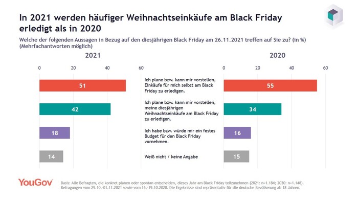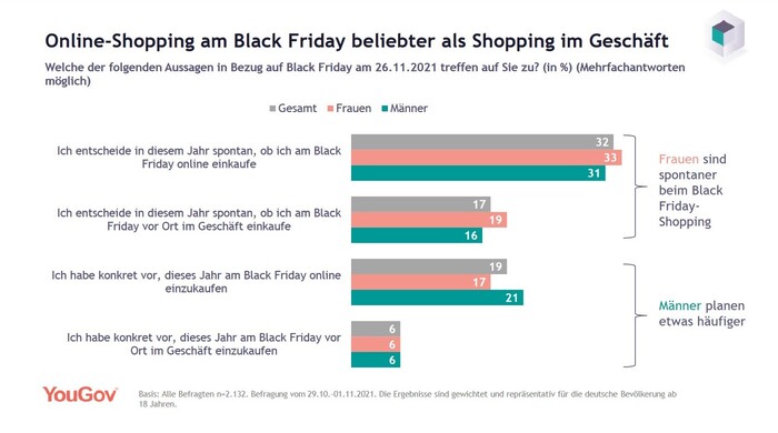 Dies sind Ergebnisse einer aktuellen und repräsentativen Onlineumfrage der internationalen Data & Analytics Group YouGov. Unter jenen Deutschen, die entweder konkret planen oder spontan entscheiden wollen, am Black Friday zu shoppen, sagen 51 Prozent, dass sie an jenem Tag Einkäufe für sich selbst erledigen wollen. Im letzten Jahr sagten dies 55 Prozent anlässlich des Black Friday 2020. Ihre diesjährigen Weihnachtseinkäufe an diesem Tag zu erledigen, können sich wiederum 42 Prozent in diesem Jahr vorstellen, 8 Prozent mehr als im letzten Jahr (34 Prozent in 2020).