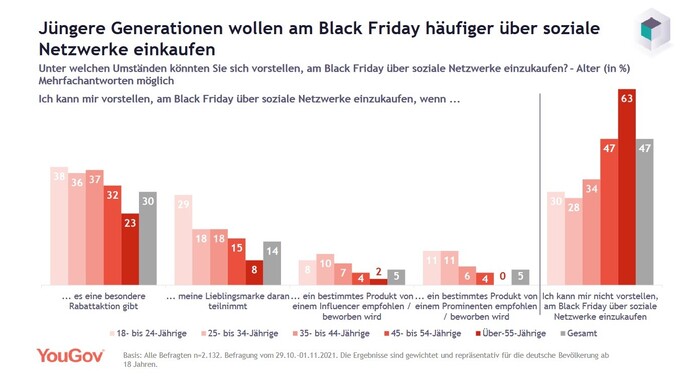 41 Prozent der Deutschen geben an, sich unter bestimmten Umständen vorstellen zu können, am Black Friday über soziale Netzwerke einzukaufen: unter ihnen 30 Prozent, wenn es eine besondere Rabattaktion gibt. Dies sagen Befragte im Alter von 18 bis 24 Jahren am häufigsten (38 Prozent). 14 Prozent aller Deutschen können sich Social Shopping am Black Friday vorstellen, wenn ihre Lieblingsmarke daran teilnimmt. Auch dies sagen die jüngsten Befragten, jene der Generation Z (18 bis 24 Jahre) am häufigsten (29 Prozent).
