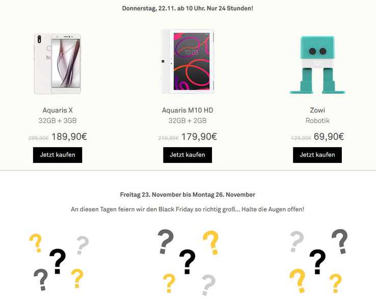 BQ weist die Käufer darauf hin, dass die auf der Black-Friday-Seite beworbenen Angebote nur für 24 Stunden verfügbar sind. Bei Preisvergleichen gilt es außerdem zu beachten, dass die Angebotspreise und die Rabattangaben sich jeweils auf die UVPs des Herstellers beziehen.