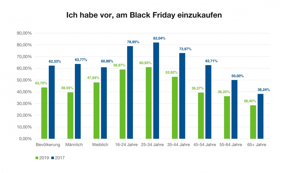Wichtiger als das Geschlecht ist für das Interesse am Black Friday-Shopping allerdings das Alter. 99,1 Prozent der VerbraucherInnen im Alter von 16 bis 24 Jahren kennen den Black Friday und 59,0 Prozent möchten an diesem Tag einkaufen. Bei den 25- bis 34-jährigen ist der Shopping-Event besonders populär: Jeder in dieser Altersgruppe kennt den Black Friday und 60,9 Prozent möchten dieses Jahr am Black Friday einkaufen.
