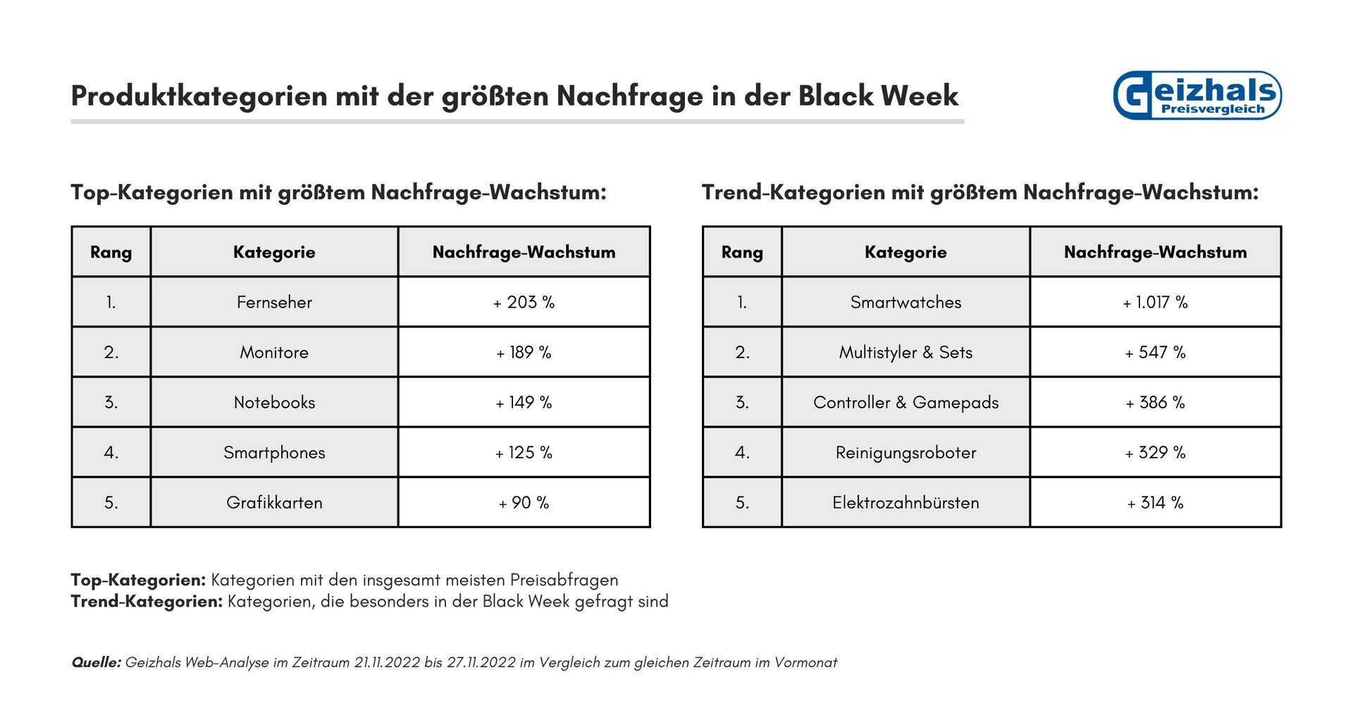 Im Durchschnitt die höchsten Rabatte gab es bei: Multimedia-Playern (-30 %), PS5-Spielen (-29 %), PS4-Games (-27 %), Xbox One- und Xbox Series-Spielen (-24 %) sowie bei Controllern und Gamepads (-24 %). Bei den Top-Kategorien verzeichneten Fernseher (-13 %), Notebooks (-13 %), Monitore (-10 %), Smartwatches (-9 %) und Smartphones (-9 %) in der vergangenen Black Week die größte durchschnittliche Preisreduktion.