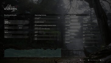 Der Benchmark zeigt eine reproduzierbare Flug-Sequenz mit der Kamera durch den Dschungel und soll wahrscheinlich die typische Last im Spiel zeigen. Am Ende sieht man eine detaillierte Zusammenfassung der Frameraten. Da das Spiel, laut veröffentlichten Gameplay-Szenen, ein actionreiches Third-Party-RPG mit zahlreichen Kämpfen ist, sollte man eine Framerate von mindestens 60 fps anvisieren.