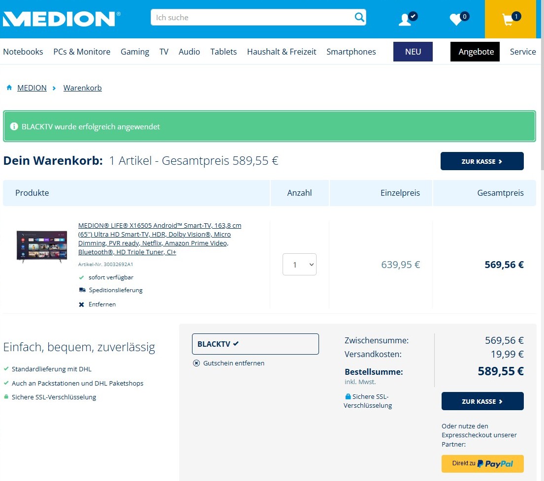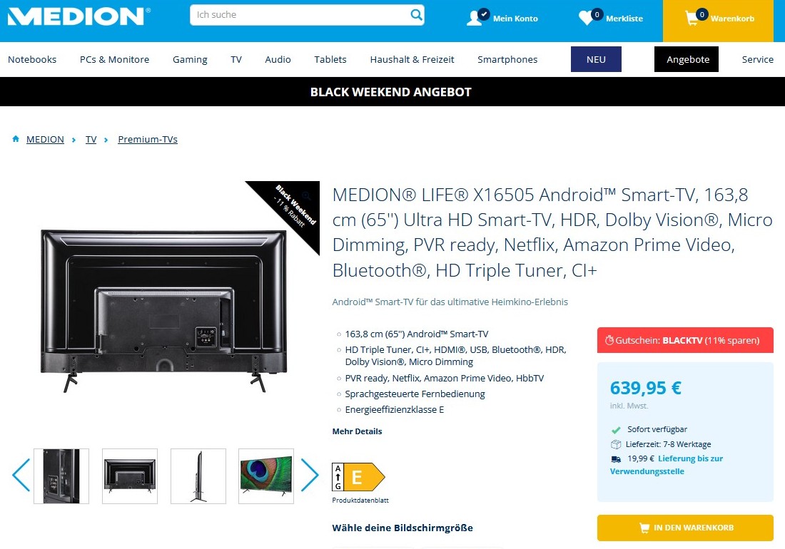 Wir haben für euch als Angebotsbeispiel zum Black Friday Weekend Medions bestes Stück Medion Life X16566 65 Zoll (MD 33990) als Spitzenmodell seiner Android-Ultra-HD-Fernseher herausgepickt. Mit dem Gutscheincode BLACKTV könnt ihr euch den Life X16566 65 Zoll Android UHD Smart TV mit Google Play, Apps Amazon Prime Video und Netflix, Dolby Vision, Motion Picture Index 1.200, HDR10 und Micro Dimming mit 11 Prozent Preisnachlass vom regulären Preis 639,95 Euro, jetzt besonders günstig zum Hammerpreis von nur 589,55 Euro schnappen.