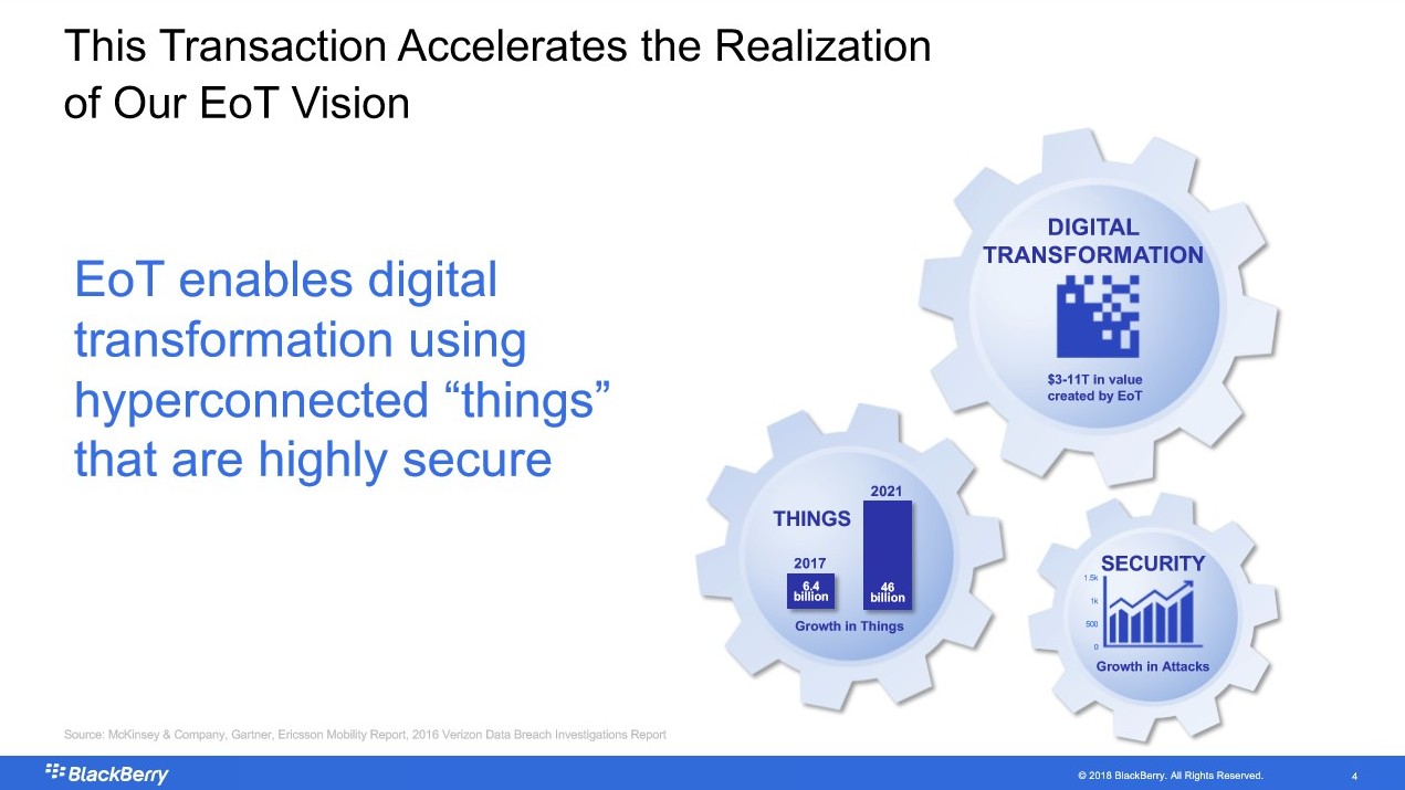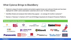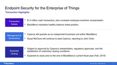 BlackBerry will mit dem Know-how von Cylance und deren KI-basierter Cybersecurity-Plattform ab sofort sein Portfolio bei BlackBerry UEM (Unified Endpoint Management) und QNX ergänzen. Mit der nun hinzugekauften Cylance-Technologie soll die sichere Chip-to-Edge-Kommunikationsplattform BlackBerry Spark für die Umsetzung des Enterprise of Things (EoT) zukünftig unverzichtbar sein, so BlackBerry. BlackBerry plant, dass Cylance nach dem erwarteten Abschluss der Transaktion als eigenständige Geschäftseinheit innerhalb von BlackBerry Limited agieren wird.