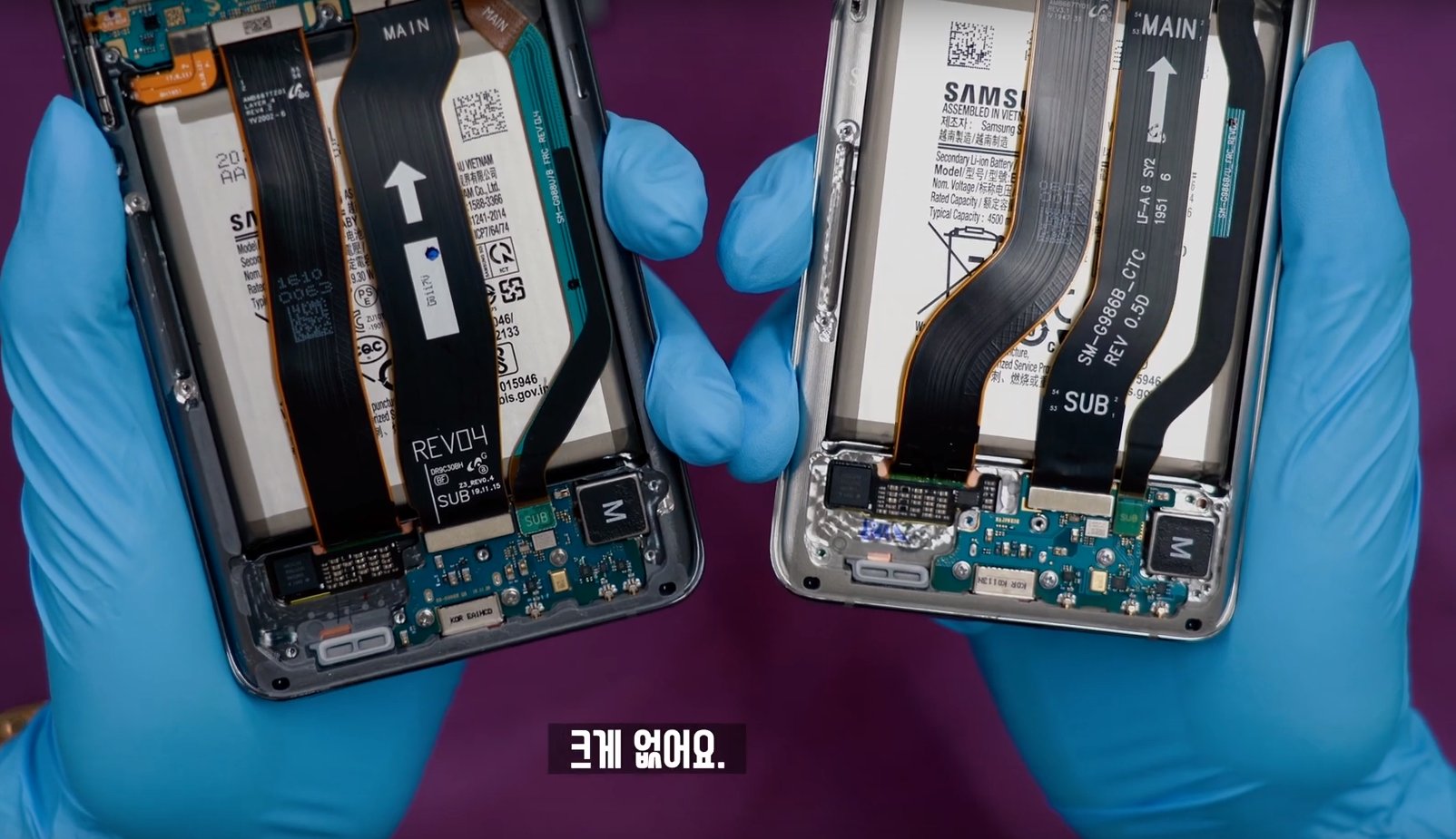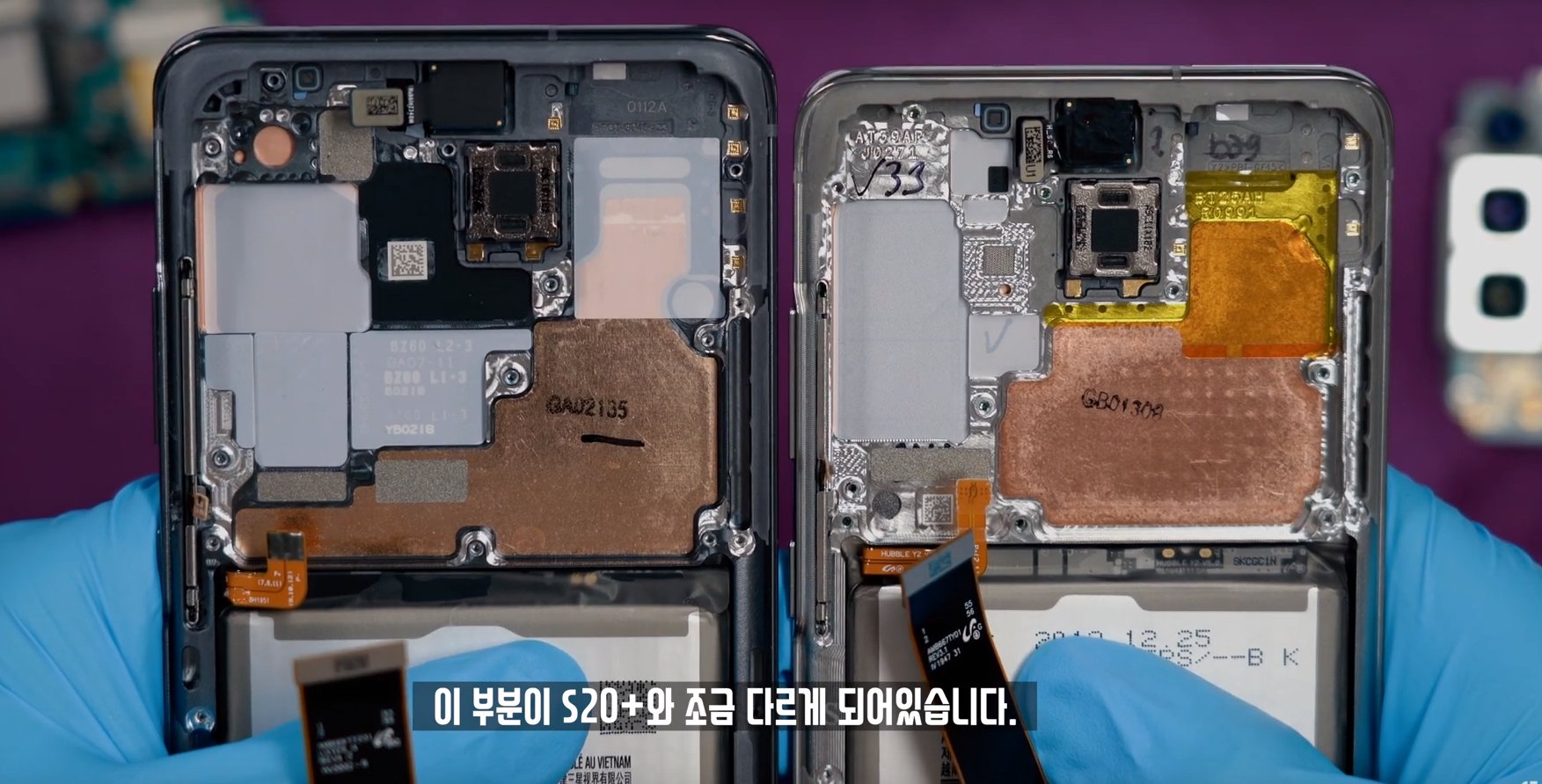 Wie man an den Bildern oben und unten aus Südkorea sehen kann, unterscheiden sich Mainboards von Galaxy S20 Ultra und Galaxy S20+ im Vergleich doch deutlich voneinander. Das im Bild oben links blos gelegte Mainboard wird durch die größeren Kamera-Module dominiert, auffällig ist etwa die deutlich größere Hauptkamera mit 108 Megapixel-Sensor dahinter.