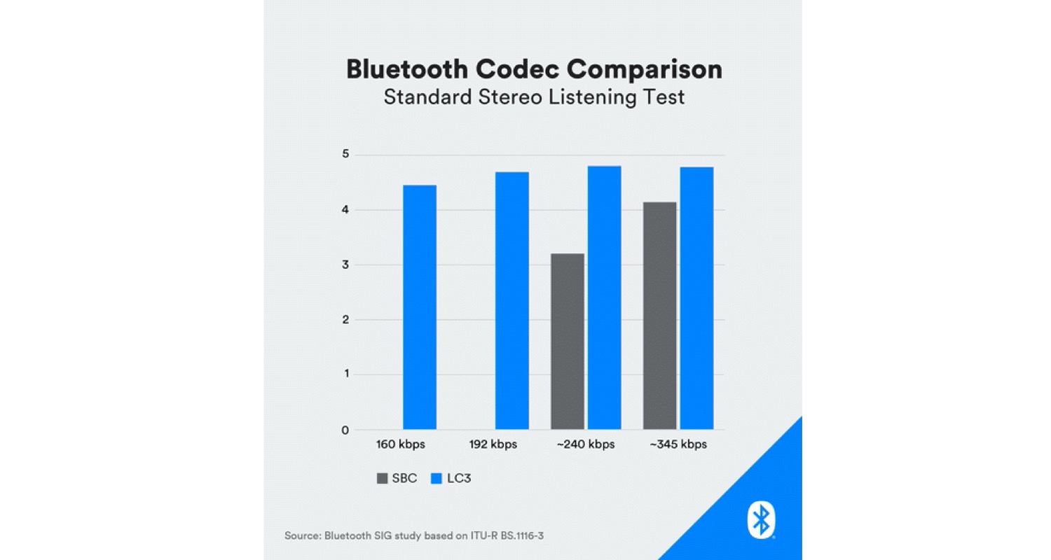 Eines der Highlights des neuen Standards ist der LC3-Codec, der laut der Bluetooth SIG eine deutlich bessere Qualität auch bei geringeren Datenraten ermöglicht. Im unten eingebetteten Diagramm wurde die Qualität diverser Datenraten in einem Hörtest verglichen, in dem 160 kbit/s LC3 besser abgeschnitten hat als 345 kbit/s SBC – der Codec, der bisher standardmäßig verwendet wurde.
