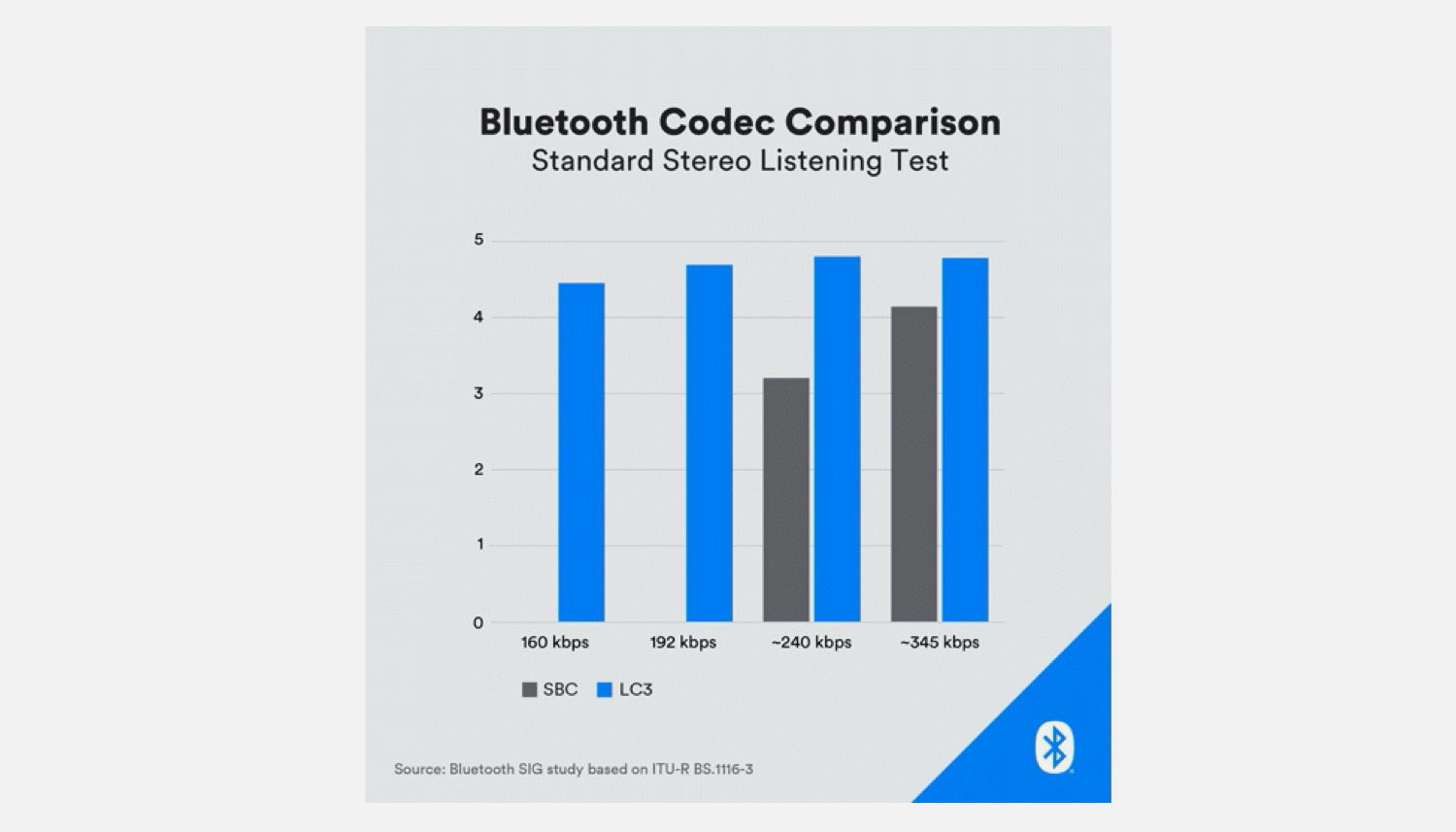 Laut der Bluetooth SIG klingt selbst eine LC3-Verbindung mit einer Datenrate von 160 kbit/s besser als die maximale SBC-Datenrate von 345 kbit/s. So kann die Akkulaufzeit von Kopfhörern verbessert werden, ohne Kompromisse bei der Wiedergabequalität hinnehmen zu müssen. Alternativ kann auch LC3 mit 345 kbit/s übertragen werden, um die Qualität weiter zu verbessern.