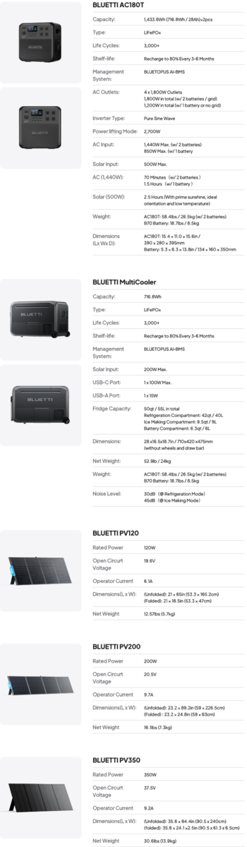 Die neue Powerstation Bluetti AC180T ist prinzipiell ein klassischer Solargenerator, nur dass der Energiespeicher durch die modulare Batterie B70 entnommen werden kann. Bis zu zwei Stück davon passen in das Gerät, sodass maximal 1.800 W und 1.433,6 Wh parat stehen. Neben mehreren AC-Steckdosen und USB-Anschlüssen bietet die neue Bluetti AC180T Powerstation (ebenso wie der MultiCooler) unter anderem ein Touch-Display sowie eine App-Steuerung.