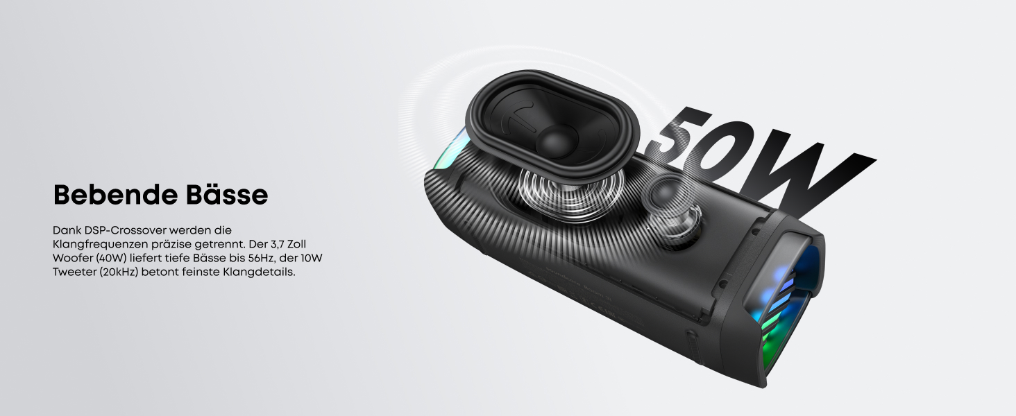 Angegeben wird eine maximale Ausgangsleistung von 50 Watt und eine maximale Lautstärke von 96 dB, BassUp 2.0 soll dann entsprechend eine stärkere Wiedergabe von Bässen bieten. Verbaut sind ein 3,7-Zoll-Woofer mit bis zu 40 Watt und ein Hochtöner einer Leistung von 10 Watt. Die Laufzeit wird bei mittlerer Lautstärke und ohne Lichteffekte und Bass-Verstärkung mit bis zu 16 Stunden angegeben. Sprachnachrichten lassen sich aufnehmen und dann über Bluetooth senden, eine Alarmfunktion ist vorhanden. Im Lieferumfang befindet sich neben einem USB Typ C-Kabel auch noch ein abnehmbarer Tragegurt.