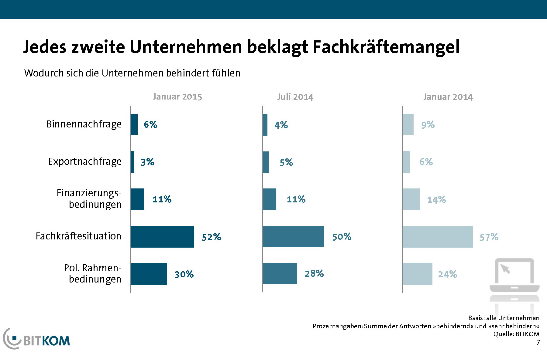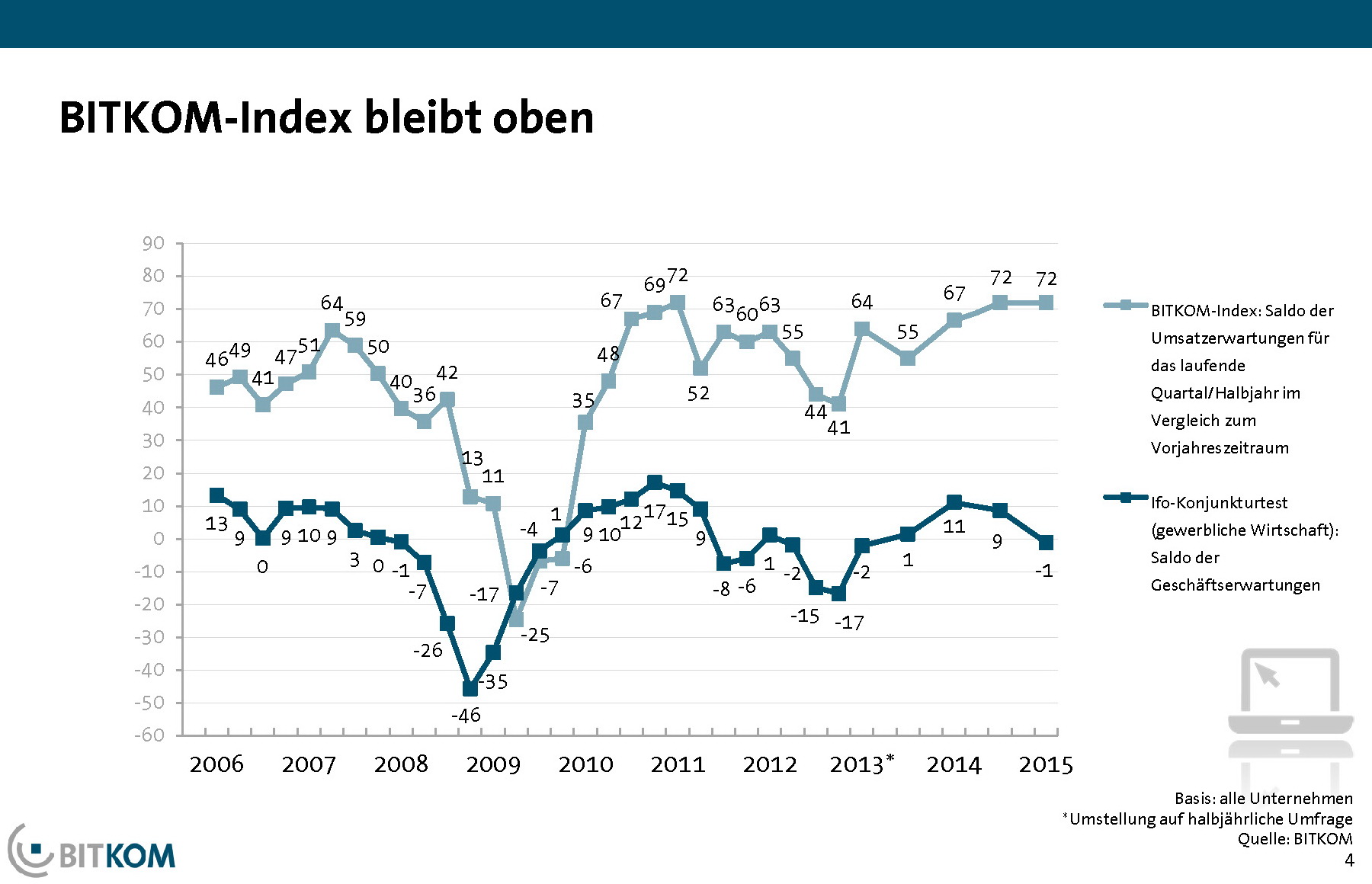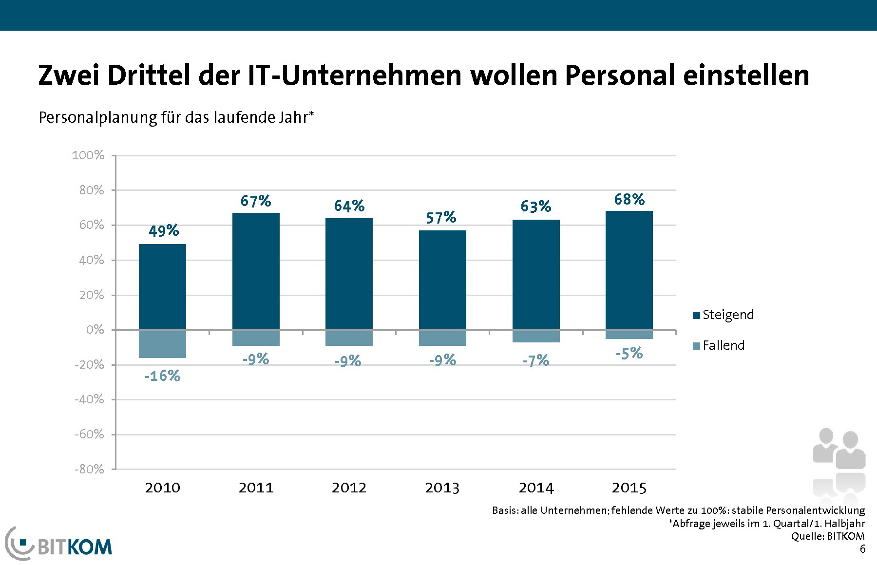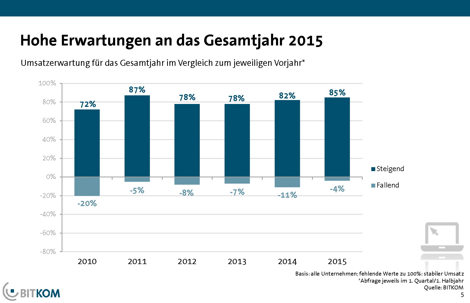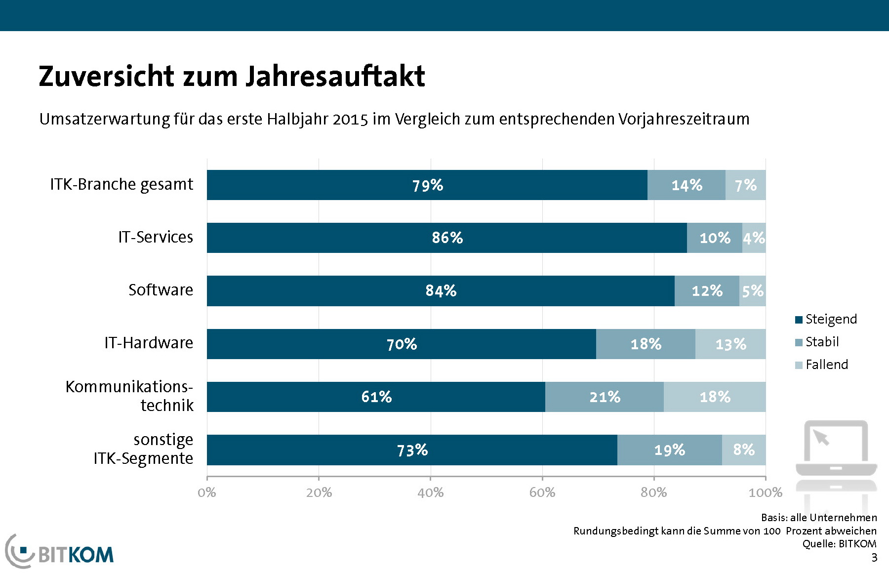 Gemäß dem Bitkom profitieren die insgesamt guten Geschäftserwartungen in der Branche noch von der positiven Entwicklung im zweiten Halbjahr 2014. 74 Prozent berichten von Umsatzsteigerungen zwischen Juli und Dezember, 12 Prozent von rückläufigen Umsätzen. Für das Gesamtjahr 2015 erwarten 85 Prozent der ITK-Unternehmen steigende und 4 Prozent sinkende Umsätze. Mehr Arbeitsplätze: 68 Prozent planen neue Mitarbeiter einzustellen (2014: 63 Prozent).