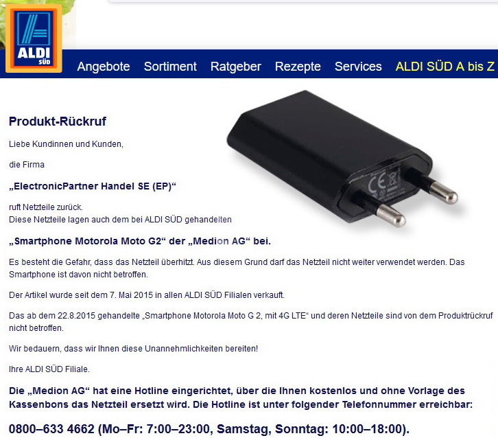 Produkt-Rückruf: Aldi und Medion informieren ihre Kunden über eine Rückrufaktion von Smartphone-Netzteilen wegen Brandgefahr. Die gefährlichen Netzteile stammen laut der Unternehmensmeldung von der Firma ElectronicPartner Handel SE (EP) und lagen auch dem bei Aldi Nord und Aldi Süd gehandelten Smartphone Motorola Moto G2 der Medion AG bei.