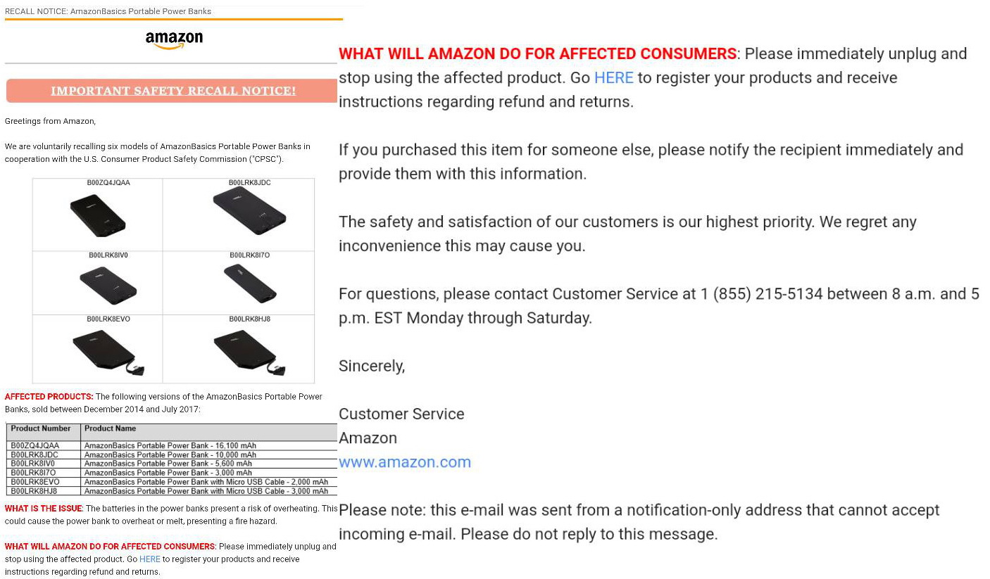 Amazon.com ruft zusammen mit der U.S. Consumer Product Safety Commission (CPSC) insgesamt sechs Modelle seiner unter der Eigenmarke AmazonBasics vertriebenen Powerbanks wegen Brandgefahr zurück. Die externen Akkus können sich überhitzen, das Gehäuse schmelzen und in Folge ein Feuer auslösen, heißt es in einem Anschreiben, das Käufer der entsprechenden Powerbanks via E-Mail von Amazon erhalten haben.