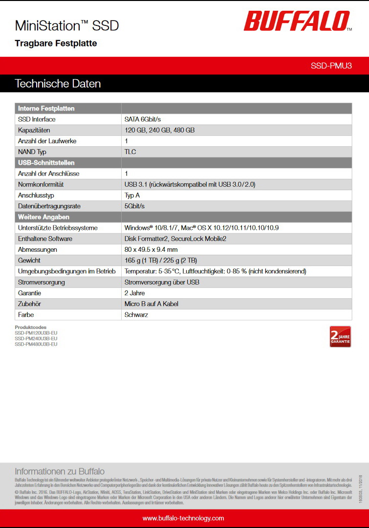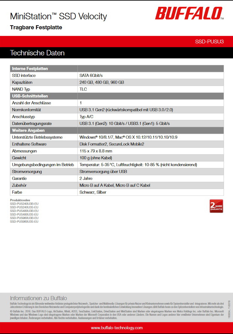 Die MiniStation SSD punktet mit TLC-NAND Abmessungen von 80 x 49,5 x 9,4 Millimetern, einem Gewicht von 30 Gramm und Speicherkapazitäten von 120 GB, 240 GB oder 480 GB. Über die USB-3.1-Schnittstelle erreicht die MiniStation SSD laut Buffalo eine Leseleistung von über 420 MB/s und über 370 MB/s beim Schreiben.
