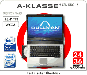 Die BullMan A-Klasse ist eines der preiswertesten Business-Notebooks für den Einsatz im Büro und unterwegs. Das 15.4" grosse Display mit antireflektierender Beschichtung läßt sich bequem arbeiten. Mit einem Gesamtgewicht von 2.6 KG ist die A-Klasse auch hervorragend für den mobilen Einsatz ausgelegt.