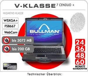 Das erfolgreichste Notebook von BullMan wurde für die neueste Intel Core Duo Technologie völlig neu entwickelt. Herausgekommen ist ein Referenz Notebook mit völlig neuen Eigenschaften. Die V-Klasse steht seit jeher für ein Maximum an Leistung in Verbindung mit einem optimierten Power- und Strom-Managment. Integriert wurde ebenfalls die leistungsstärkste Mobile Plattform, die es gibt: Intel Core 2 Duo (Doppelkern) mit dem schnellsten FrontSidebus mit 667 MHz in Verbindung mit der austauschbaren Power Grafikkarte nVidia GeForce Go 7600 mit 256MB DDR3 Grafik-RAM. Die V-Klasse ist mit den neuen 200GB S-ATA Festplatten aufrüstbar.
