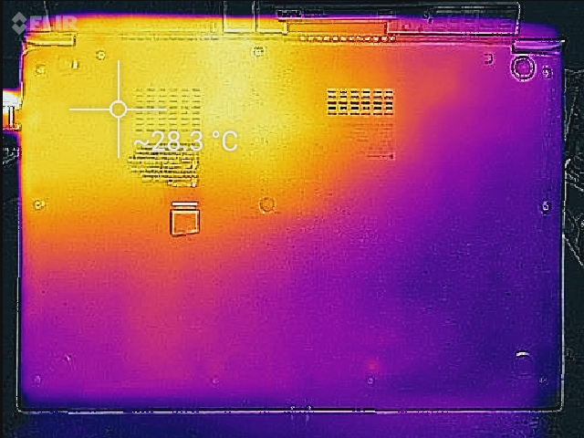 Über die Oberflächentemperaturen können wir uns absolut nicht beschweren. Unter starker Last gibt es einen Hitzebereich direkt über der CPU, aber selbst diese Stelle wird nicht unangenehm heiß. Der Rest des Gehäuses bleibt kühl. Daher kann das Tecra X50 bei den meisten Arbeiten auch bequem auf dem Schoß verwendet werden.