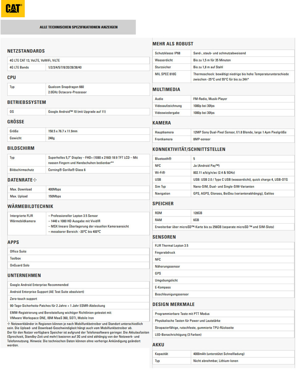 Das CAT S62 Pro arbeitet bei der Wärmebildtechnik mit einem professionellen FLIR Lepton 3.5-Sensor, der eine 1.440 x 1.080 Pixel-Ausgabe mit Bildverbesserung "VividIR" bietet. Bullitt nennt einen Messbereich von -20 Grad Celsius bis 400° C. Angetrieben wird das 248 Gramm schwere und 158,5 x 76,7 x 11,9 mm messende CAT S62 Pro von einem Qualcomm Snapdragon 660 Octacore-Prozessor, der von 6/128 GB Speicher (RAM/ROM) unterstützt wird.