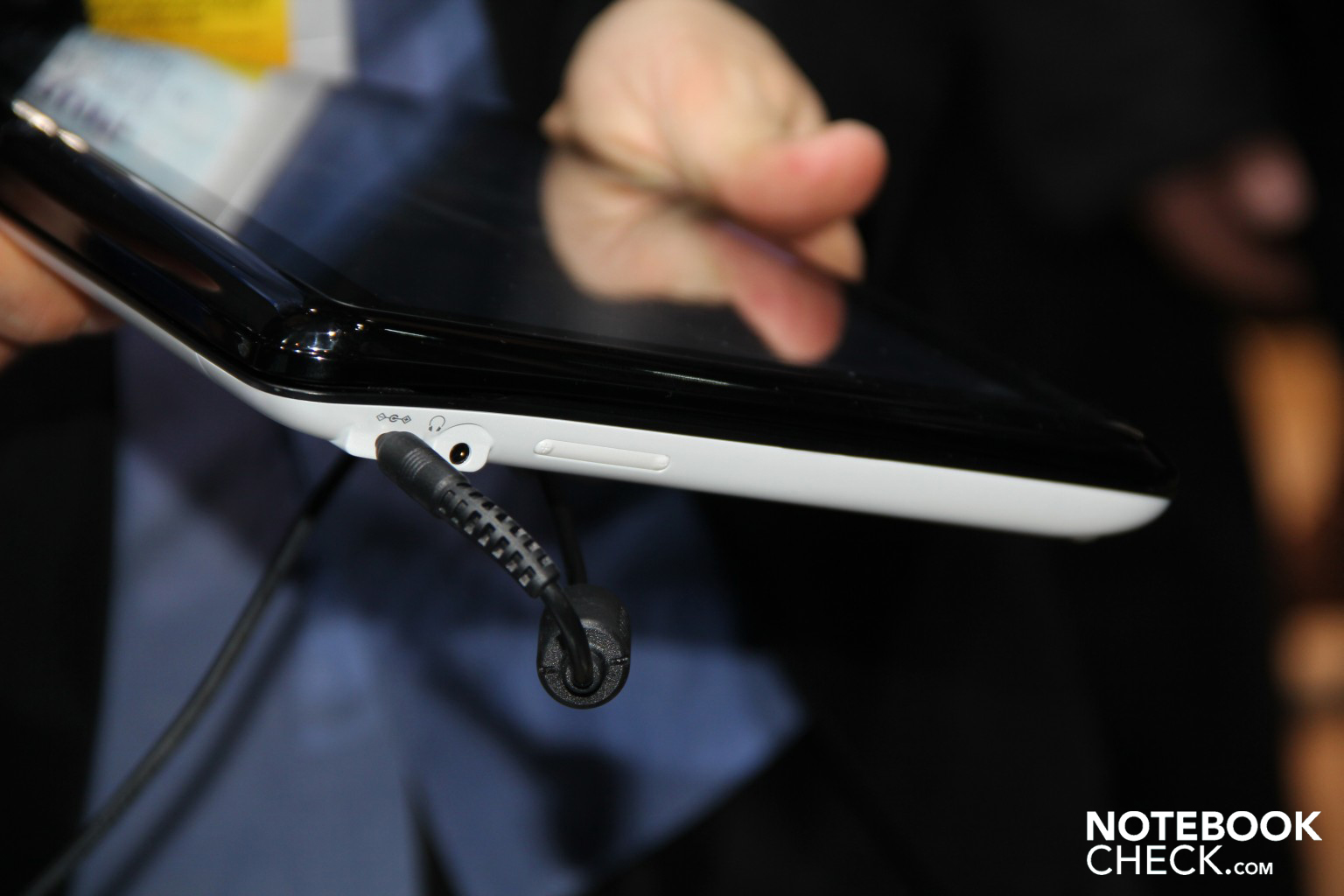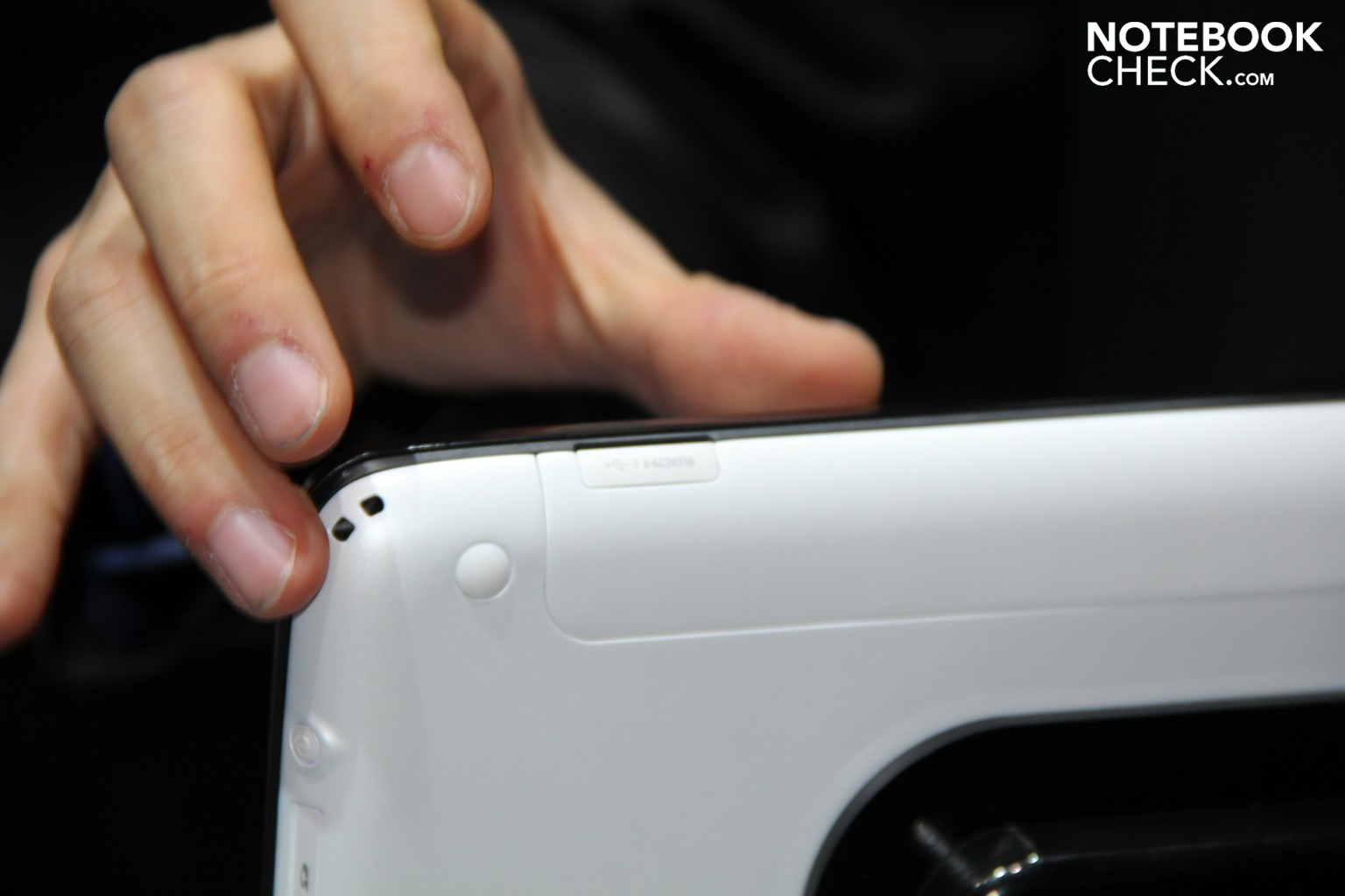 Der Schnittstellenumfang ist nicht sonderlich groß und ist eher auf den Tablet-Betrieb ausgelegt. An der linken Seite finden sich der Stromanschluss, eine 3,5mm-Stereo-Klinke und eine Wippe für die integrierten Lautsprecher. Gegenüber sind ein MicroSD-Kartenleser, der Power-Button und ein mini HDMI-Anschluss. Die Rückseite wird durch einen Diebstahlschutz verdeckt, aber die integrierte Kamera (1.3 Megapixel) ist deutlich zu erkennen.