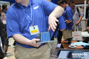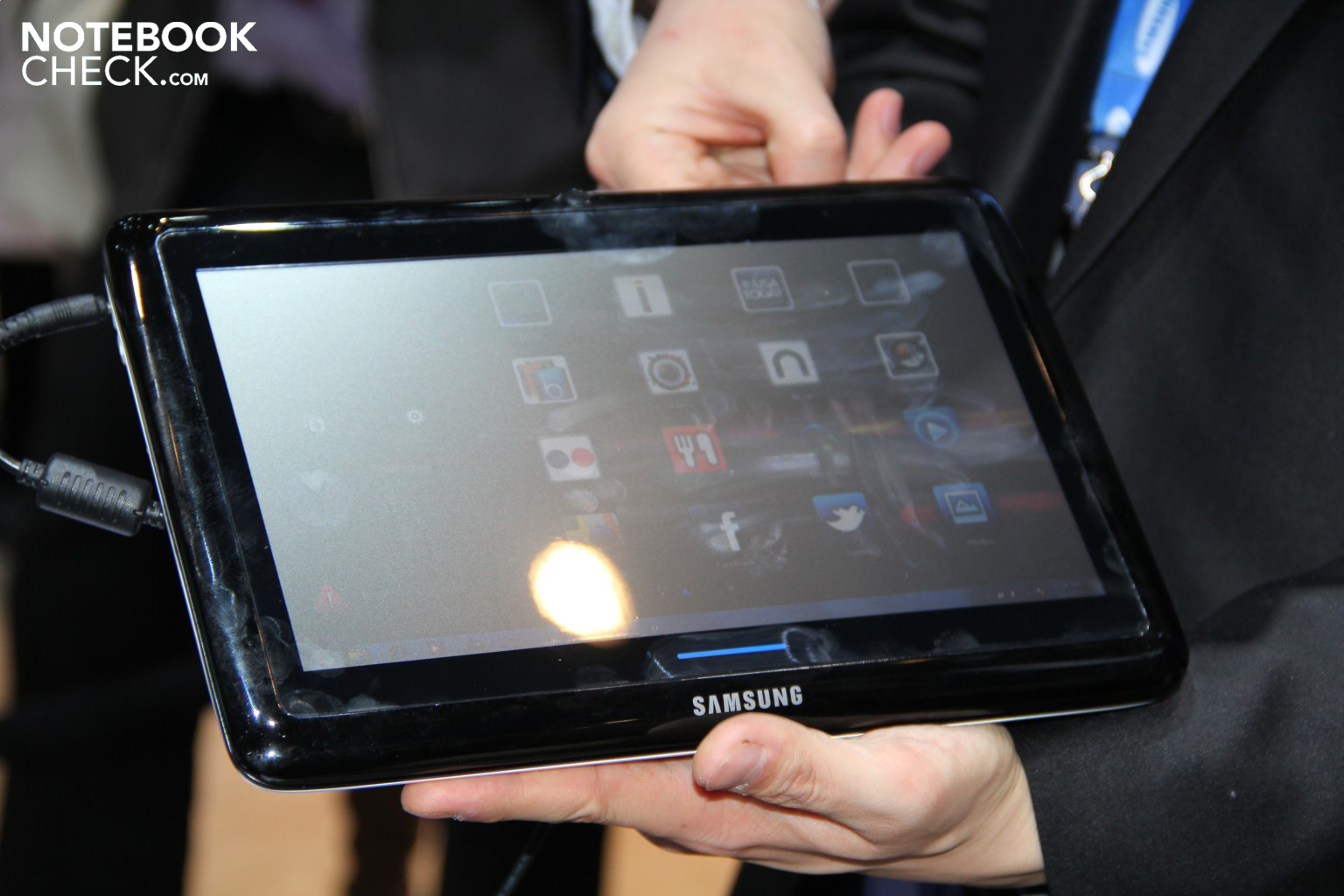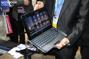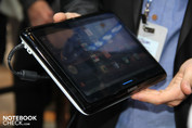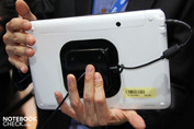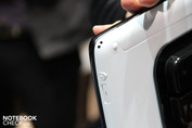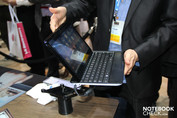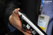 Nach der Pressekonferenz und eigenen Produktfotos konnten wir uns auf dem Stand von Samsung einen ersten Eindruck des Sliding PC 7 verschaffen. Ausgestellt wurden lediglich einige Preproduction Sample, die von Samsung-Mitarbeitern vorgeführt wurden. Den Slidermechanismus durften wir dabei nicht testen, aber der erste Eindruck überzeugt. Durch einfaches Aufschieben und Neigen den Bildschirms genügen um ein Netbook zu erhalten. Ein weiterer Nachteil: der volle Schnittstellenumfang ist nicht gegeben und so fehlte beispielsweise noch die USB-2.0-Schnittstelle. Die endgültige Bestückung war nicht zu sehen.
