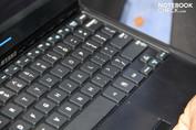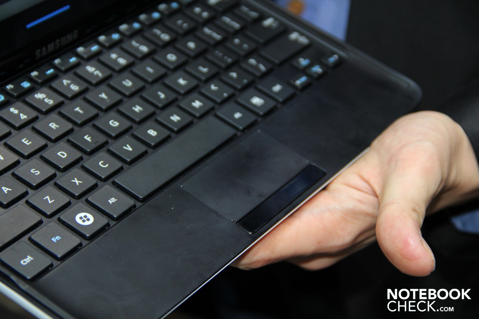Die Chiclet-Style Tastatur entspricht einem Netbook mit 10-Zoll-Anzeige und ist je nach Modell mit blauen oder schwarzen Tasten versehen. Erfreulich sind die zwei großen Shift-Tasten an den Seiten der Tastatur. Das Touchpad bietet eine leicht angeraute Oberfläche, die keine gekennzeichneten Scrollbereiche aufweist. Vermutlich wird das Gerät einige Multi-Touch-Gesten unterstützen. Die Maustasten unter dem Touchpad befinden sich unter eine schwarzen Leiste und sind nicht voneinander getrennt.