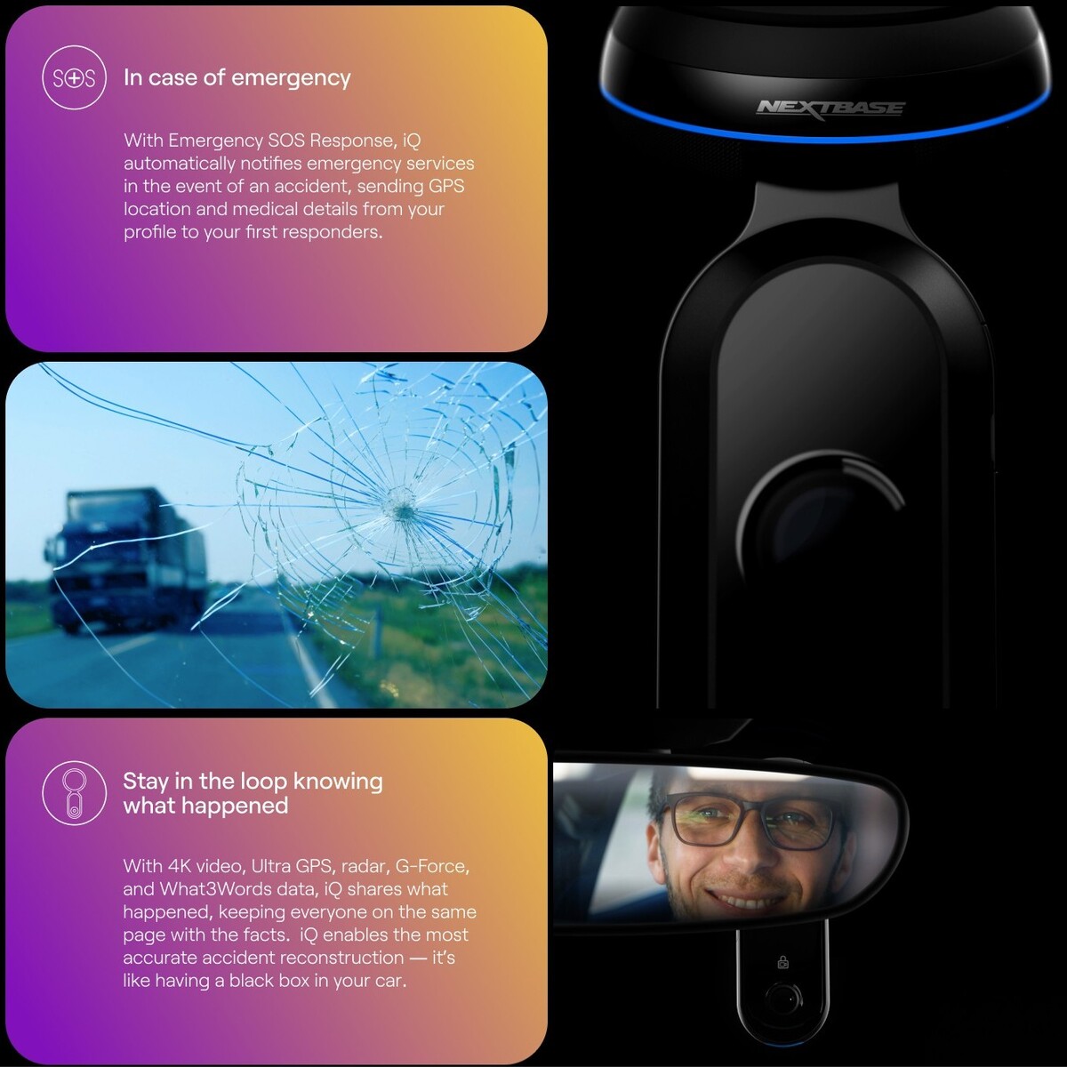 - Über die Nextbase iQ App bietet Nextbase iQ dem Fahrer Warnungen in Echtzeit und Zugriff auf seine Videoaufzeichnungen, auch wenn er sich nicht in seinem Fahrzeug befindet.